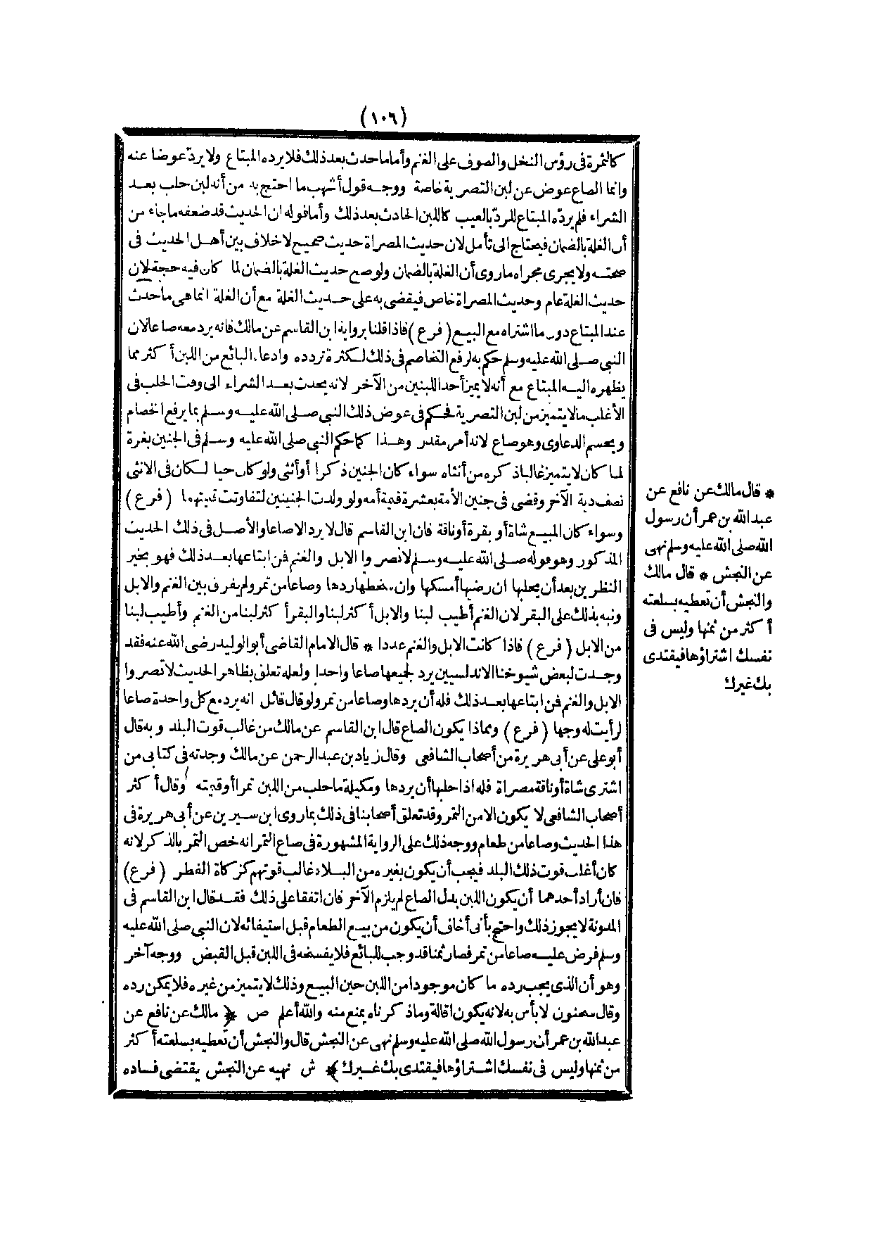وَسَوَاءٌ كَانَ الْمَبِيعُ شَاةً أَوْ بَقَرَةً أَوْ نَاقَةً فَإِنَّ ابْنَ الْقَاسِمِ قَالَ لَا يَرُدُّ إلَّا صَاعًا، وَالْأَصْلُ فِي ذَلِكَ الْحَدِيثُ الْمَذْكُورُ، وَهُوَ قَوْلُهُ - صَلَّى اللَّهُ عَلَيْهِ وَسَلَّمَ - «لَا تَصُرُّوا الْإِبِلَ وَالْغَنَمَ فَمَنْ ابْتَاعَهَا بَعْدَ ذَلِكَ فَهُوَ بِخَيْرِ النَّظَرَيْنِ بَعْدَ أَنْ يَحْلُبَهَا إنْ رَضِيَهَا أَمْسَكَهَا، وَإِنْ سَخِطَهَا رَدَّهَا، وَصَاعًا مِنْ تَمْرٍ» ، وَلَمْ يُفَرِّقْ بَيْنَ الْغَنَمِ وَالْإِبِلِ، وَنَبَّهَ بِذَلِكَ عَلَى الْبَقَرِ لِأَنَّ الْغَنَمَ أَطْيَبُ لَبَنًا وَالْإِبِلَ أَكْثَرُ لَبَنًا وَالْبَقَرَ أَكْثَرُ لَبَنًا مِنْ الْغَنَمِ، وَأَطْيَبُ لَبَنًا مِنْ الْإِبِلِ.