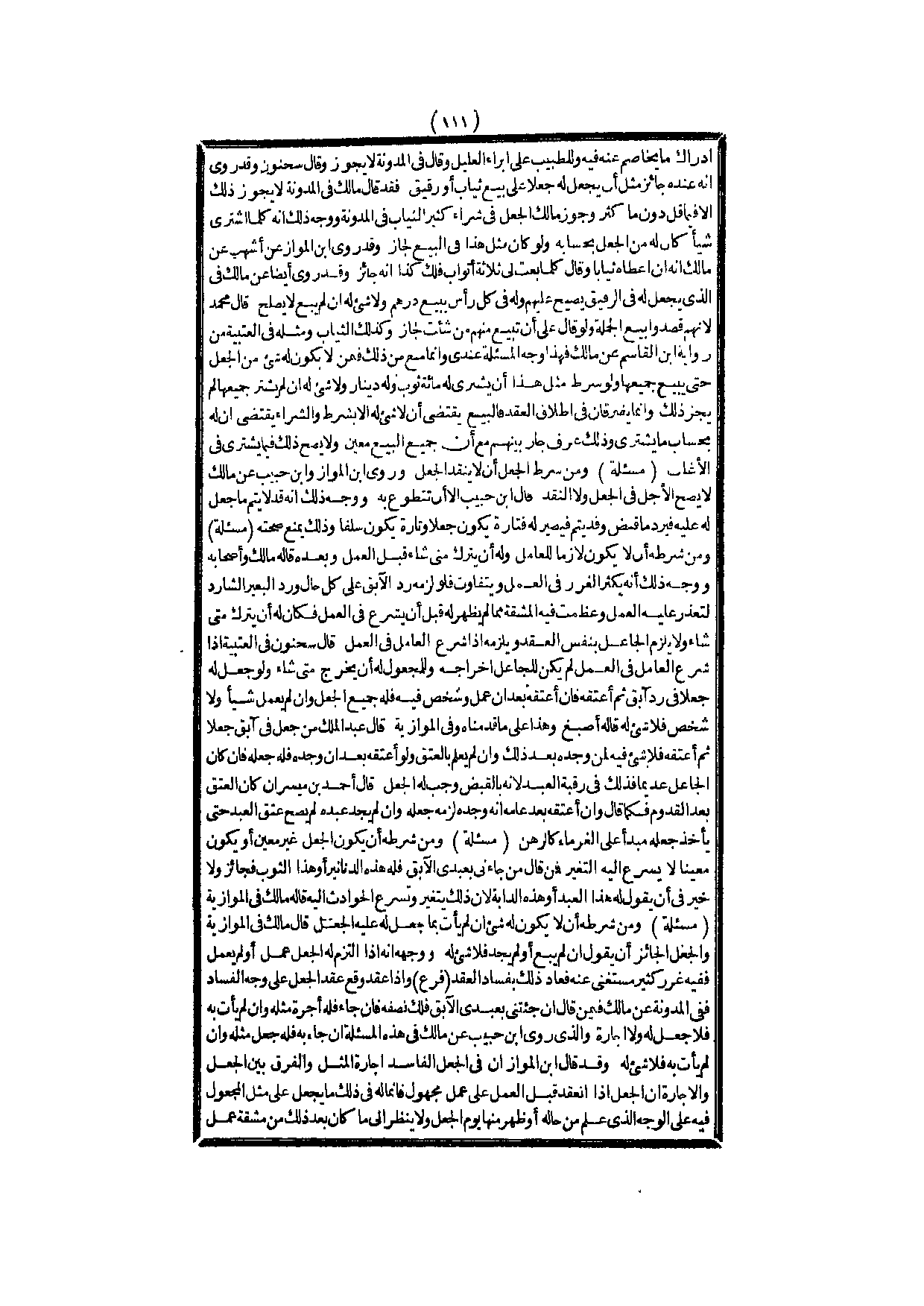 وَقَالَ سَحْنُونٌ، وَقَدْ رُوِيَ أَنَّهُ عِنْدَهُ جَائِزٌ مِثْلُ أَنْ يَجْعَلَ لَهُ جُعْلًا عَلَى بَيْعِ ثِيَابٍ أَوْ رَقِيقٍ فَقَدْ قَالَ مَالِكٌ فِي الْمُدَوَّنَةِ لَا يَجُوزُ ذَلِكَ إلَّا فِيمَا قَلَّ دُونَ مَا كَثُرَ، وَجَوَّزَ مَالِكٌ الْجُعْلَ فِي شِرَاءِ كَثِيرِ الثِّيَابِ فِي الْمُدَوَّنَةِ، وَوَجْهُ ذَلِكَ أَنَّهُ كُلَّمَا اشْتَرَى شَيْئًا كَانَ لَهُ مِنْ الْجُعْلِ بِحِسَابِهِ، وَلَوْ كَانَ مِثْلُ هَذَا فِي الْبَيْعِ لَجَازَ.