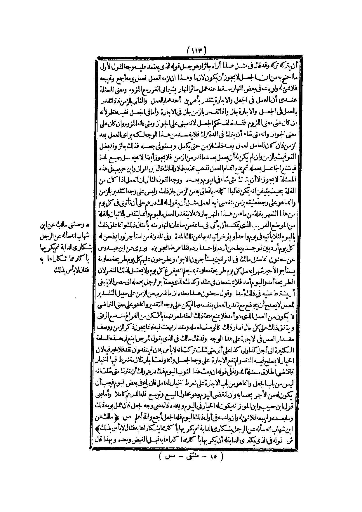 ـــــــــــــــــــــــــــــQأَنْ يَتْرُكَهُ تَرَكَهُ، وَقَدْ قَالَ فِي مِثْلِ هَذَا أَرَاهُ جَائِزًا، وَهُوَ جُلُّ قَوْلِهِ الَّذِي يُعْتَمَدُ عَلَيْهِ وَجْهُ الْقَوْلِ الْأَوَّلِ مَا احْتَجَّ مِنْ أَنَّ الْجُعْلَ لَا يَجُوزُ أَنْ يَكُونَ لَازِمًا، وَهَذَا إنْ لَزِمَهُ الْعَمَلُ فَعَمِلَ يَوْمَهُ أَجْمَعَ، وَلَوْ يَبِعْهُ فَلَا شَيْءَ لَهُ، وَلَوْ بَاعَهُ فِي بَعْضِ النَّهَارِ سَقَطَ عَنْهُ عَمَلُ سَائِرِ النَّهَارِ يُشِيرُ إلَى الْغَرَرِ مَعَ اللُّزُومِ.