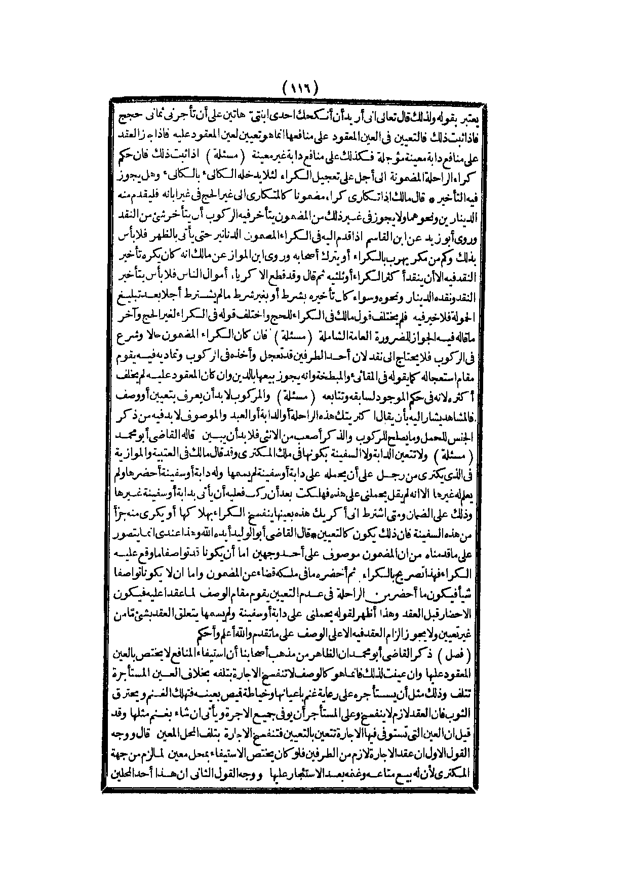 وَلَا تَتَعَيَّنُ الدَّابَّةُ وَلَا السَّفِينَةُ بِكَوْنِهَا فِي مِلْكِ الْمُكْتَرِي وَقَدْ قَالَ مَالِكٌ فِي الْعُتْبِيَّةِ وَالْمَوَّازِيَّةِ فِي الَّذِي يَكْتَرِي مِنْ رَجُلٍ عَلَى أَنْ يَحْمِلَهُ عَلَى دَابَّةٍ أَوْ سَفِينَةٍ لَمْ يُسَمِّهَا وَلَهُ دَابَّةٌ أَوْ سَفِينَةٌ أَحْضَرَهَا وَلَمْ يَعْلَمْ لَهُ غَيْرَهَا إلَّا أَنَّهُ لَمْ يَقُلْ يَحْمِلُنِي عَلَى هَذِهِ فَهَلَكَتْ بَعْدَ أَنْ رَكِبَ فَعَلَيْهِ أَنْ يَأْتِيَ بِدَابَّةٍ أَوْ سَفِينَةٍ غَيْرِهَا وَذَلِكَ عَلَى الضَّمَانِ وَمَتَى اشْتَرَطَ أَنِّي أُكْرِيكَ هَذِهِ بِعَيْنِهَا يَنْفَسِخُ الْكِرَاءُ بِهَلَاكِهَا أَوْ يُكْرِي مِنْهُ جُزْءًا مِنْ هَذِهِ السَّفِينَةِ فَإِنَّ ذَلِكَ يَكُونُ كَالتَّعْيِينِ قَالَ الْقَاضِي أَبُو الْوَلِيدِ أَيَّدَهُ اللَّهُ: وَهَذَا عِنْدِي إنَّمَا يُتَصَوَّرُ عَلَى مَا قَدَّمْنَاهُ مِنْ أَنَّ الْمَضْمُونَ مَوْصُوفٌ عَلَى أَحَدِ وَجْهَيْنِ إمَّا أَنْ يَكُونَا قَدْ تَوَاصَفَا مَا وَقَعَ عَلَيْهِ الْكِرَاءَ فَهَذَا تَصْرِيحٌ بِالْكِرَاءِ ثُمَّ أَحْضَرَهُ مَا فِي مِلْكِهِ قَضَاءً عَنْ الْمَضْمُونِ وَإِمَّا أَنْ لَا يَكُونَا تَوَاصَفَا شَيْئًا فَيَكُونَ مَا أَحْضَرَ مِنْ الرَّاحِلَةِ فِي عَدَمِ التَّعْيِينِ يَقُومُ مُقَامَ الْوَصْفِ لِمَا عَقَدَا عَلَيْهِ فَيَكُونُ الْإِحْضَارُ قَبْلَ الْعَقْدِ وَهَذَا أَظْهَرُ لِقَوْلِهِ يَحْمِلُنِي عَلَى دَابَّةٍ أَوْ سَفِينَةٍ وَلَمْ يُسَمِّهَا يَتَعَلَّقُ الْعَقْدُ بِشَيْءٍ مَا مِنْ غَيْرِ تَعْيِينٍ وَلَا يَجُوزُ إلْزَامُ الْعَقْدِ فِيهِ إلَّا عَلَى الْوَصْفِ عَلَى مَا تَقَدَّمَ، وَاَللَّهُ أَعْلَمُ وَأَحْكَمُ.
