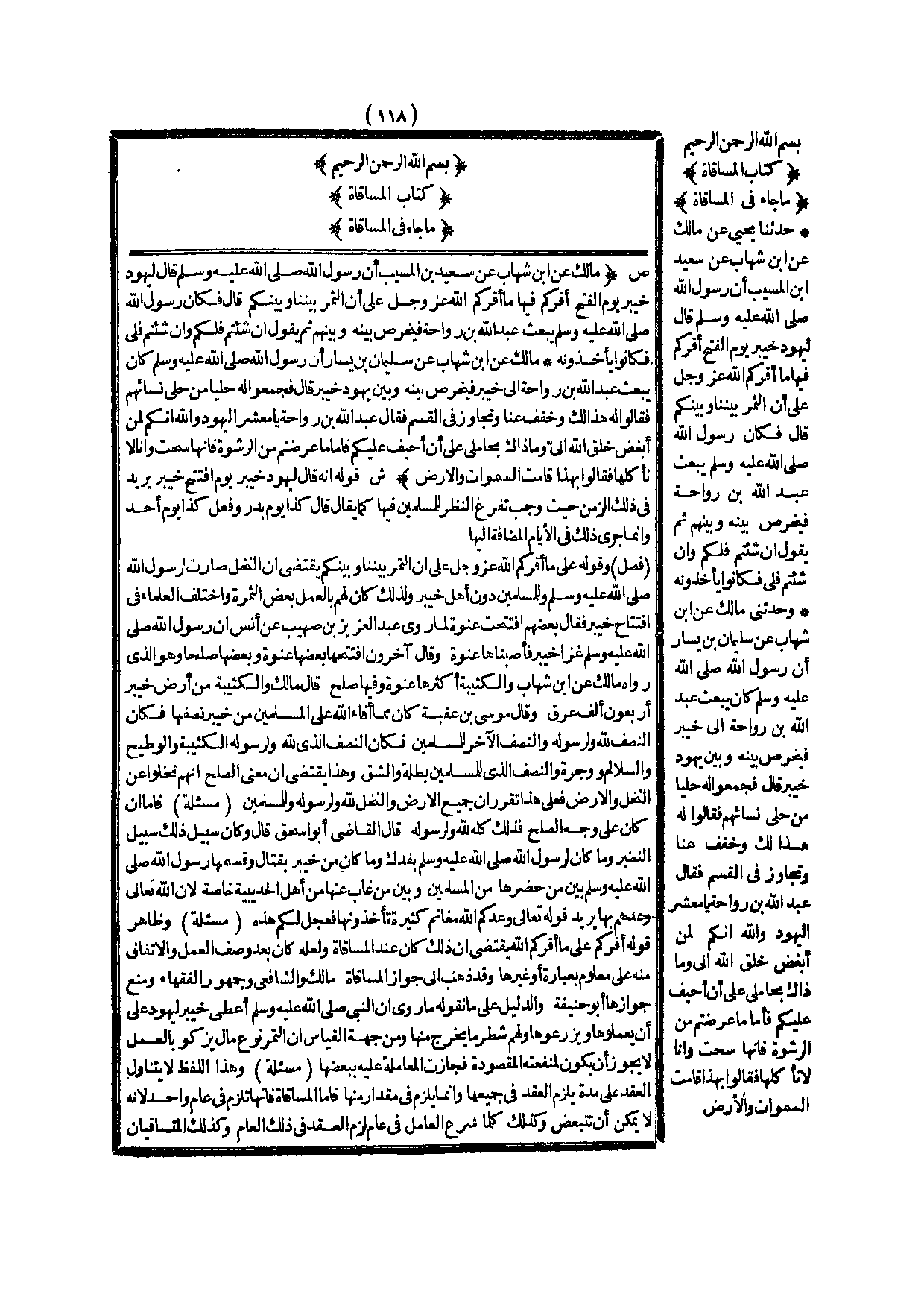 بِسْمِ اللَّهِ الرَّحْمَنِ الرَّحِيمِ) (كِتَابُ الْمُسَاقَاةِ) (مَا جَاءَ فِي الْمُسَاقَاةِ) (ص) : مَالِكٌ عَنْ ابْنِ شِهَابٍ عَنْ سَعِيدِ بْنِ الْمُسَيِّبِ «أَنَّ رَسُولَ اللَّهِ - صَلَّى اللَّهُ عَلَيْهِ وَسَلَّمَ - قَالَ لِيَهُودِ خَيْبَرَ يَوْمَ الْفَتْحِ أُقِرُّكُمْ فِيهَا مَا أَقَرَّكُمْ اللَّهُ عَزَّ وَجَلَّ عَلَى أَنَّ الثَّمَرَ بَيْنَنَا وَبَيْنَكُمْ قَالَ فَكَانَ رَسُولُ اللَّهِ - صَلَّى اللَّهُ عَلَيْهِ وَسَلَّمَ - يَبْعَثُ عَبْدَ اللَّهِ بْنَ رَوَاحَةَ فَيَخْرُصُ بَيْنَهُ وَبَيْنَهُمْ ثُمَّ يَقُولُ إنْ شِئْتُمْ فَلَكُمْ، وَإِنْ شِئْتُمْ فَلِي فَكَانُوا يَأْخُذُونَهُ» مَالِكٌ عَنْ ابْنِ شِهَابٍ عَنْ سُلَيْمَانَ بْنِ يَسَارٍ «أَنَّ رَسُولَ اللَّهِ - صَلَّى اللَّهُ عَلَيْهِ وَسَلَّمَ - كَانَ يَبْعَثُ عَبْدَ اللَّهِ بْنَ رَوَاحَةَ إلَى خَيْبَرَ فَيَخْرُصُ بَيْنَهُ وَبَيْنَ يَهُودِ خَيْبَرَ قَالَ فَجَمَعُوا لَهُ حُلِيًّا مِنْ حُلِيِّ نِسَائِهِمْ فَقَالُوا لَهُ هَذَا لَك، وَخَفِّفْ عَنَّا وَتَجَاوَزْ فِي الْقَسْمِ فَقَالَ عَبْدُ اللَّهِ بْنُ رَوَاحَةَ: يَا مَعْشَرَ الْيَهُودِ، وَاَللَّهِ إنَّكُمْ لَمِنْ أَبْغَضِ خَلْقِ اللَّهِ إلَيَّ، وَمَا ذَاكَ بِحَامِلِي عَلَى أَنْ أَحِيفَ عَلَيْكُمْ، فَأَمَّا مَا عَرَضْتُمْ مِنْ الرِّشْوَةِ فَإِنَّهَا سُحْتٌ، وَإِنَّا لَا نَأْكُلُهَا. فَقَالُوا: بِهَذَا قَامَتْ السَّمَوَاتُ وَالْأَرْضُ»
