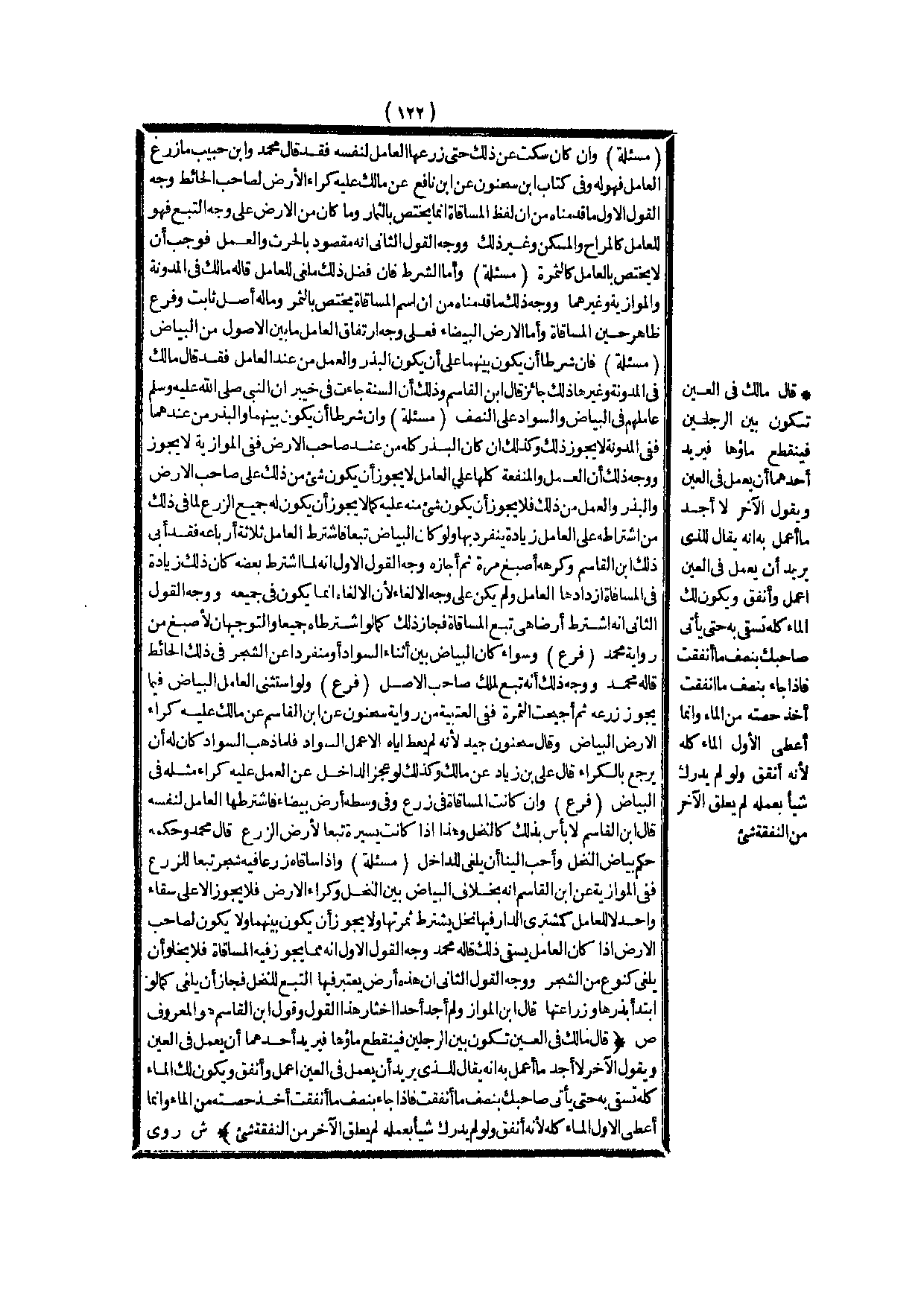 وَإِنْ كَانَتْ الْمُسَاقَاةُ فِي زَرْعٍ، وَفِي وَسَطِهِ أَرْضٌ بَيْضَاءُ فَاشْتَرَطَهَا الْعَامِلُ لِنَفْسِهِ قَالَ ابْنُ الْقَاسِمِ لَا بَأْسَ بِذَلِكَ كَالنَّخْلِ، وَهَذَا إذَا كَانَتْ يَسِيرَةً تَبَعًا لِأَرْضِ الزَّرْعِ قَالَ مُحَمَّدٌ، وَحُكْمُهُ حُكْمُ بَيَاضِ النَّخْلِ، وَأَحَبُّ إلَيْنَا أَنْ يُلْغِيَ لِلدَّاخِلِ.