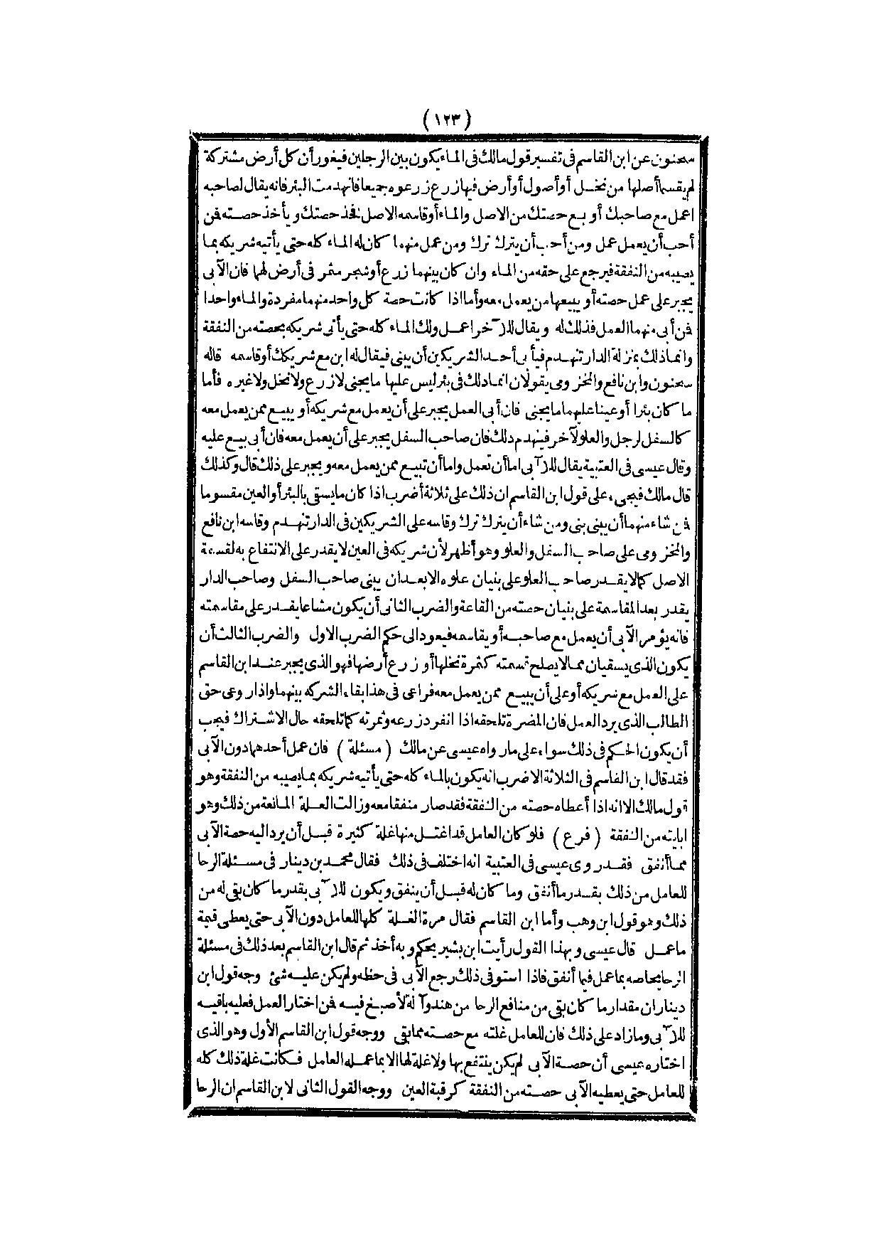 ـــــــــــــــــــــــــــــQسَحْنُونٌ عَنْ ابْنِ الْقَاسِمِ فِي تَفْسِيرِ قَوْلِ مَالِكٍ فِي الْمَاءِ يَكُونُ بَيْنَ الرَّجُلَيْنِ فَيَغُورُ أَنَّ كُلَّ أَرْضٍ مُشْتَرَكَةٍ لَمْ يَقْسِمَا أَصْلَهَا مِنْ نَخْلٍ أَوْ أُصُولٍ أَوْ أَرْضٍ فِيهَا زَرْعٌ زَرَعُوهُ جَمِيعًا فَانْهَدَمَتْ الْبِئْرُ فَإِنَّهُ يُقَالُ لِصَاحِبِهِ اعْمَلْ مَعَ صَاحِبِك أَوْ بِعْ حِصَّتَك مِنْ الْأَصْلِ، وَالْمَاءِ أَوْ قَاسِمْهُ الْأَصْلَ فَخُذْ حِصَّتَك، وَيَأْخُذُ حِصَّتَهُ فَمَنْ أَحَبَّ أَنْ يَعْمَلَ عَمِلَ، وَمَنْ أَحَبَّ أَنْ يَتْرُكَ تَرَكَ، وَمَنْ عَمِلَ مِنْهُمَا كَانَ لَهُ الْمَاءُ كُلُّهُ حَتَّى يَأْتِيَهُ شَرِيكُهُ بِمَا يُصِيبُهُ مِنْ النَّفَقَةِ فَيَرْجِعَ عَلَى حَقِّهِ مِنْ الْمَاءِ، وَإِنْ كَانَ بَيْنَهُمَا زَرْعٌ أَوْ شَجَرٌ مُثْمِرٌ فِي أَرْضٍ لَهُمَا فَإِنَّ الْآبِيَ يُجْبَرُ عَلَى عَمَلِ حِصَّتِهِ أَوْ يَبِيعُهَا مَنْ يَعْمَلُ مَعَهُ.