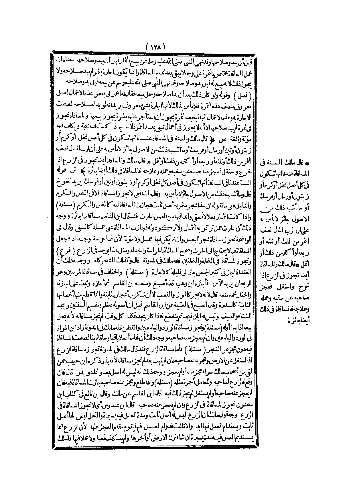 (ص) : (قَالَ مَالِكٌ وَالسُّنَّةُ فِي الْمُسَاقَاةِ عِنْدَنَا أَنَّهَا تَكُونُ فِي كُلِّ أَصْلٍ نَخْلٍ أَوْ كَرْمٍ أَوْ زَيْتُونٍ أَوْ تِينٍ أَوْ رُمَّانٍ أَوْ فِرْسِكٍ أَوْ مَا أَشْبَهَ ذَلِكَ مِنْ الْأُصُولِ جَائِزٌ لَا بَأْسَ بِهِ عَلَى أَنَّ لِرَبِّ الْمَالِ نِصْفَ الثَّمَرِ مِنْ ذَلِكَ أَوْ ثُلُثَهُ أَوْ رُبْعَهُ أَوْ أَكْثَرَ مِنْ ذَلِكَ أَوْ أَقَلَّ قَالَ مَالِكٌ وَالْمُسَاقَاةُ أَيْضًا تَجُوزُ فِي الزَّرْعِ إذَا خَرَجَ وَاسْتَقَلَّ فَعَجَزَ صَاحِبُهُ عَنْ سَقْيِهِ وَعَمَلِهِ وَعِلَاجِهِ فَالْمُسَاقَاةُ فِي ذَلِكَ أَيْضًا جَائِزَةٌ)