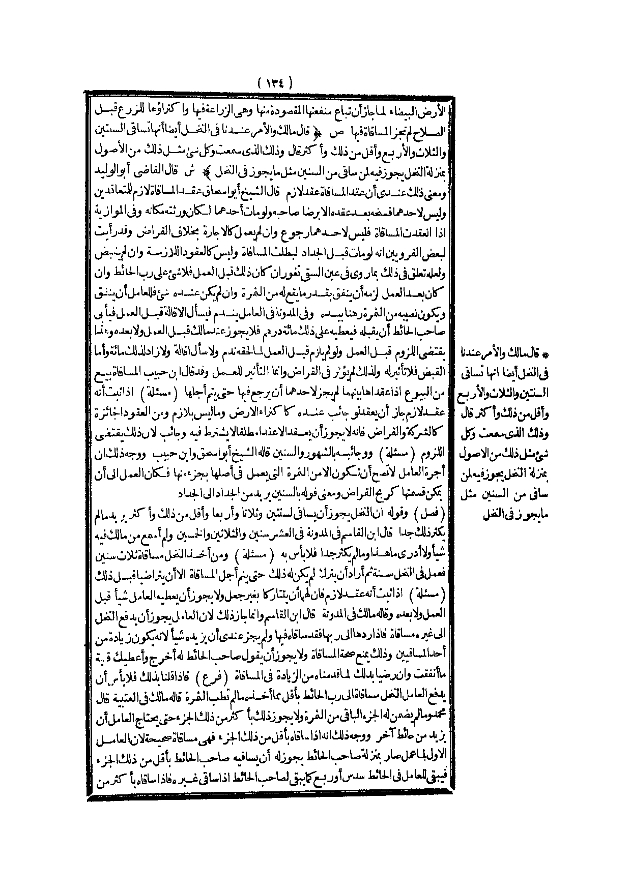 (ش) : قَالَ الْقَاضِي أَبُو الْوَلِيدِ، وَمَعْنَى ذَلِكَ عِنْدِي أَنَّ عَقْدَ الْمُسَاقَاةِ عَقْدٌ لَازِمٌ قَالَ الشَّيْخُ أَبُو إِسْحَاقَ عَقْدٌ الْمُسَاقَاةِ لَازِمٌ لِلْمُتَعَاقِدَيْنِ، وَلَيْسَ لِأَحَدِهِمَا فَسْخُهُ بَعْدَ عَقْدِهِ إلَّا بِرِضَا صَاحِبِهِ، وَلَوْ مَاتَ أَحَدُهُمَا لَكَانَ، وَرَثَتُهُ مَكَانَهُ، وَفِي الْمَوَّازِيَّةِ إذَا انْعَقَدَتْ الْمُسَاقَاةُ فَلَيْسَ لِأَحَدِهِمَا رُجُوعٌ، وَإِنْ لَمْ يَعْمَلْ كَالْإِجَارَةِ بِخِلَافِ الْقِرَاضِ، وَقَدْ رَأَيْت لِبَعْضِ الْقَرَوِيِّينَ أَنَّهُ لَوْ مَاتَ قَبْلَ الْجِدَادِ لَبَطَلَتْ الْمُسَاقَاةُ، وَلَيْسَ كَالْعُقُودِ اللَّازِمَةِ، وَإِنْ لَمْ يُقْبَضْ، وَلَعَلَّهُ تَعَلَّقَ فِي ذَلِكَ بِمَا رُوِيَ فِي عَيْنِ السَّقْيِ تَغُورُ إنْ كَانَ ذَلِكَ قَبْلَ الْعَمَلِ فَلَا شَيْءَ عَلَى رَبِّ الْحَائِطِ، وَإِنْ كَانَ بَعْدَ الْعَمَلِ لَزِمَهُ أَنْ يُنْفِقَ بِقَدْرِ مَا يَقَعُ لَهُ مِنْ الثَّمَرَةِ، وَإِنْ لَمْ يَكُنْ عِنْدَهُ شَيْءٌ فَلِلْعَامِلِ أَنْ يُنْفِقَ، وَيَكُونُ نَصِيبُهُ مِنْ الثَّمَرَةِ رَهْنًا بِيَدِهِ، وَفِي الْمُدَوَّنَةِ فِي الْعَامِلِ يَنْدَمُ فَيَسْأَلُ الْإِقَالَةَ قَبْلَ الْعَمَلِ فَيَأْبَى صَاحِبُ الْحَائِطِ أَنْ يُقِيلَهُ فَيُعْطِيَهُ عَلَى ذَلِكَ مِائَةَ دِرْهَمٍ فَلَا يَجُوزُ عِنْدَ مَالِكٍ قَبْلَ الْعَمَلِ وَلَا بَعْدَهُ، وَهَذَا يَقْتَضِي اللُّزُومَ قَبْلَ الْعَمَلِ، وَلَوْ لَمْ يَلْزَمْ قَبْلَ الْعَمَلِ لَمَا لَحِقَهُ نَدَمٌ، وَلَا سَأَلَ إقَالَةً، وَلَا زَادَ لِذَلِكَ مِائَةً، وَأَمَّا الْقَبْضُ فَلَا تَأْثِيرَ لَهُ، وَلِذَلِكَ لَمْ يُؤَثِّرْ فِي الْقِرَاضِ، وَإِنَّمَا التَّأْثِيرُ لِلْعَمَلِ.