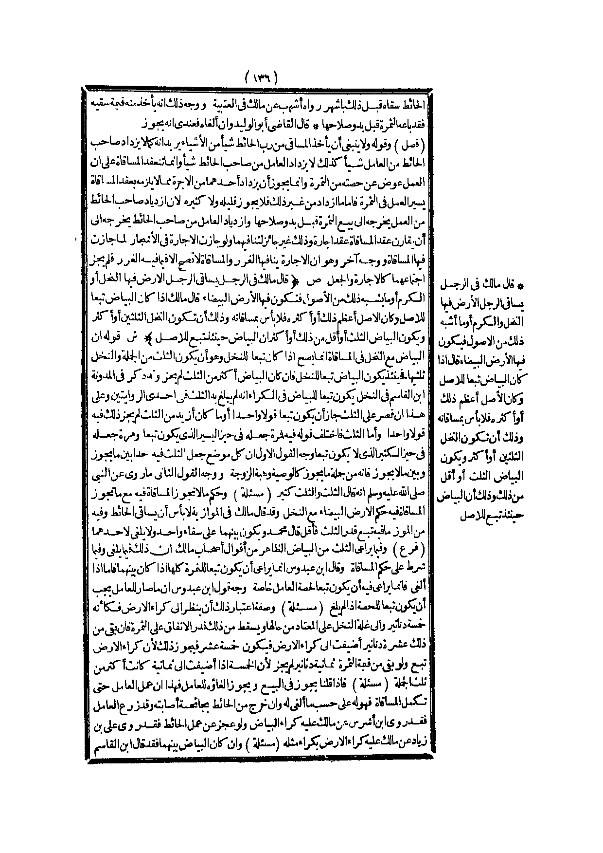 (ص) : (قَالَ مَالِكٌ فِي الرَّجُلِ يُسَاقِي الرَّجُلَ الْأَرْضَ فِيهَا النَّخْلُ أَوْ الْكَرْمُ أَوْ مَا يُشْبِهُ ذَلِكَ مِنْ الْأُصُولِ فَتَكُونُ فِيهَا الْأَرْضُ الْبَيْضَاءُ قَالَ مَالِكٌ إذَا كَانَ الْبَيَاضُ تَبَعًا لِلْأَصْلِ، وَكَانَ الْأَصْلُ أَعْظَمَ ذَلِكَ أَوْ أَكْثَرَهُ فَلَا بَأْسَ بِمُسَاقَاتِهِ، وَذَلِكَ أَنْ تَكُونَ النَّخْلُ الثُّلُثَيْنِ أَوْ أَكْثَرَ، وَيَكُونُ الْبَيَاضُ الثُّلُثَ أَوْ أَقَلَّ مِنْ ذَلِكَ أَوْ أَكْثَرَ أَنَّ الْبَيَاضَ حِينَئِذٍ تَبَعٌ لِلْأَصْلِ) .
