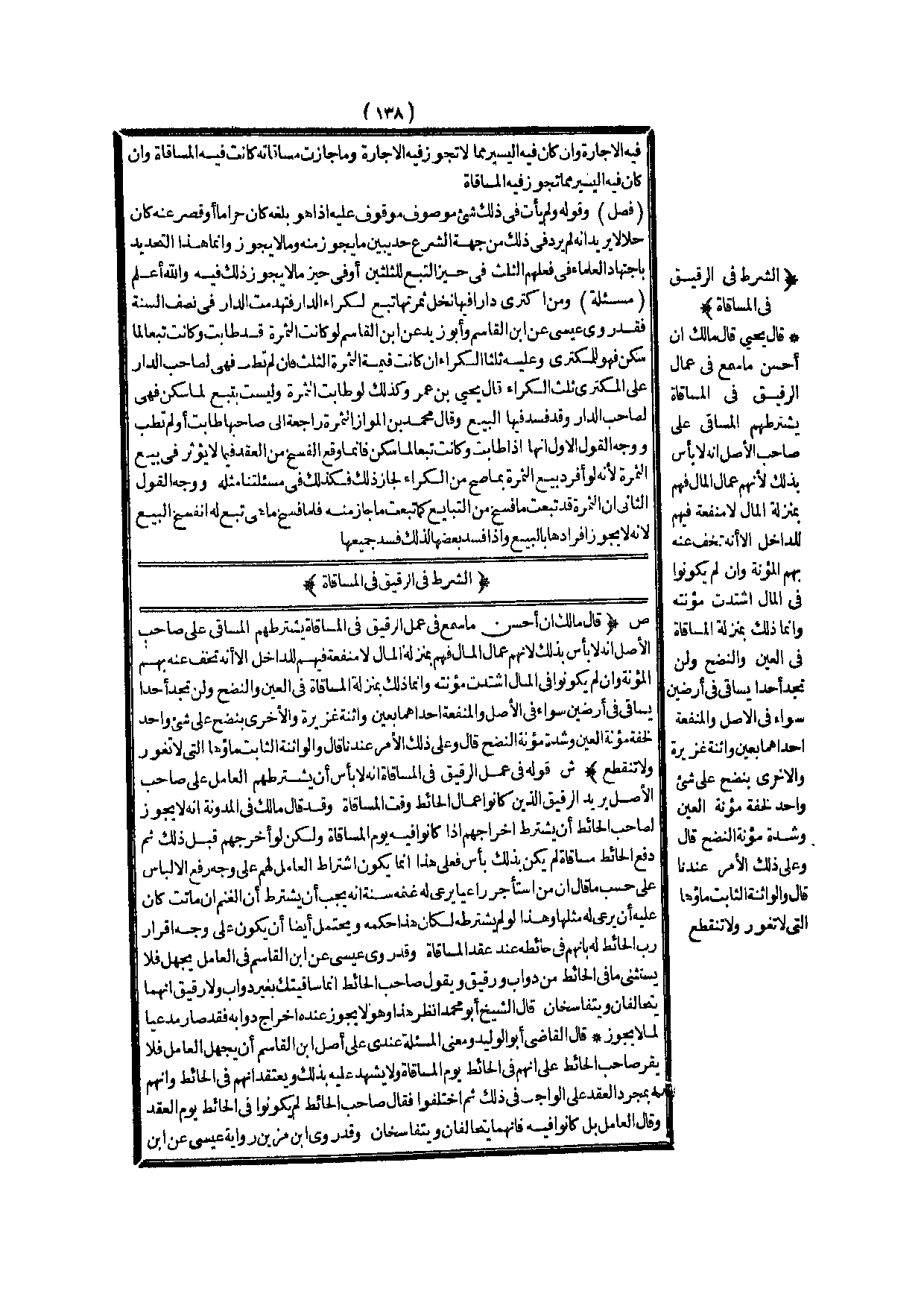 (الشَّرْطُ فِي الرَّقِيقِ فِي الْمُسَاقَاةِ) (ص) : (قَالَ مَالِكٌ: إنَّ أَحْسَنَ مَا سُمِعَ فِي عَمَلِ الرَّقِيقِ فِي الْمُسَاقَاةُ يَشْتَرِطُهُمْ الْمُسَاقَى عَلَى صَاحِبِ الْأَصْلِ أَنَّهُ لَا بَأْسَ بِذَلِكَ؛ لِأَنَّهُمْ عُمَّالُ الْمَالِ فَهُمْ بِمَنْزِلَةِ الْمَالِ لَا مَنْفَعَةَ فِيهِمْ لِلدَّاخِلِ إلَّا أَنَّهُ تَخِفُّ عَنْهُ بِهِمْ الْمُؤْنَةُ، وَإِنْ لَمْ يَكُونُوا فِي الْمَالِ اشْتَدَّتْ مُؤْنَتُهُ وَإِنَّمَا ذَلِكَ بِمَنْزِلَةِ الْمُسَاقَاةِ فِي الْعَيْنِ، وَالنَّضْحِ وَلَنْ تَجِدَ أَحَدًا يُسَاقِي فِي أَرْضَيْنِ سَوَاءٌ فِي الْأَصْلِ، وَالْمَنْفَعَةِ إحْدَاهُمَا بِعَيْنٍ وَاثِنَةٍ غَزِيرَةٍ، وَالْأُخْرَى بِنَضْحٍ عَلَى شَيْءٍ وَاحِدٍ لِخِفَّةِ مُؤْنَةِ الْعَيْنِ وَشِدَّةِ مُؤْنَةِ النَّضْحِ، قَالَ وَعَلَى ذَلِكَ الْأَمْرُ عِنْدَنَا قَالَ وَالْوَاثِنَةُ الثَّابِتُ مَاؤُهَا الَّتِي لَا تَغُورُ وَلَا تَنْقَطِعُ