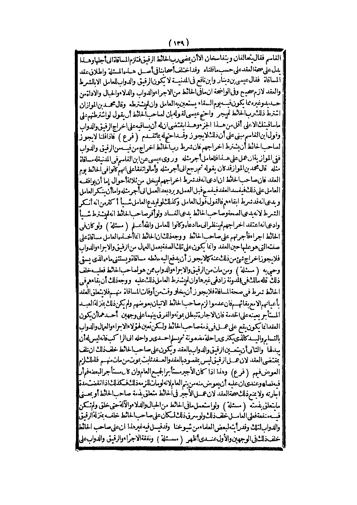 ـــــــــــــــــــــــــــــQابْنِ الْقَاسِمِ فَقَالَ يَتَحَالَفَانِ وَيَتَفَاسَخَانِ إلَّا أَنْ يُمْضِيَ رَبُّ الْحَائِطِ الرَّقِيقَ فَتَلْزَمُ الْمُسَاقَاةُ إلَى أَجَلِهَا وَهَذَا يَدُلُّ عَلَى صِحَّةِ الْعَقْدِ عَلَى حَسَبِ مَا قُلْنَاهُ، وَقَدْ اخْتَلَفَ أَصْحَابُنَا فِي أَصْلِ هَذِهِ الْمَسْأَلَةِ وَإِطْلَاقِ عَقْدِ الْمُسَاقَاةِ، فَقَالَ عِيسَى بْنُ دِينَارٍ وَابْنُ نَافِعٍ: فِي الْمُزَنِيَّة لَا يَكُونُ الرَّقِيقُ، وَالدَّوَابُّ لِلْعَامِلِ إلَّا بِالشَّرْطِ، وَالْعَقْدُ لَازِمٌ صَحِيحٌ وَفِي الْوَاضِحَةِ أَنَّ مَا فِي الْحَائِطِ مِنْ الْأُجَرَاءِ، وَالدَّوَابِّ، وَالدِّلَاءِ، وَالْحِبَالِ، وَالْأَدَاةِ مِنْ حَدِيدٍ وَغَيْرِهِ مِمَّا يَكُونُ فِيهِ يَوْمَ السِّقَاءِ يَسْتَعِينُ بِهِ الْعَامِلُ، وَإِنْ لَمْ يَشْتَرِطْهُ.