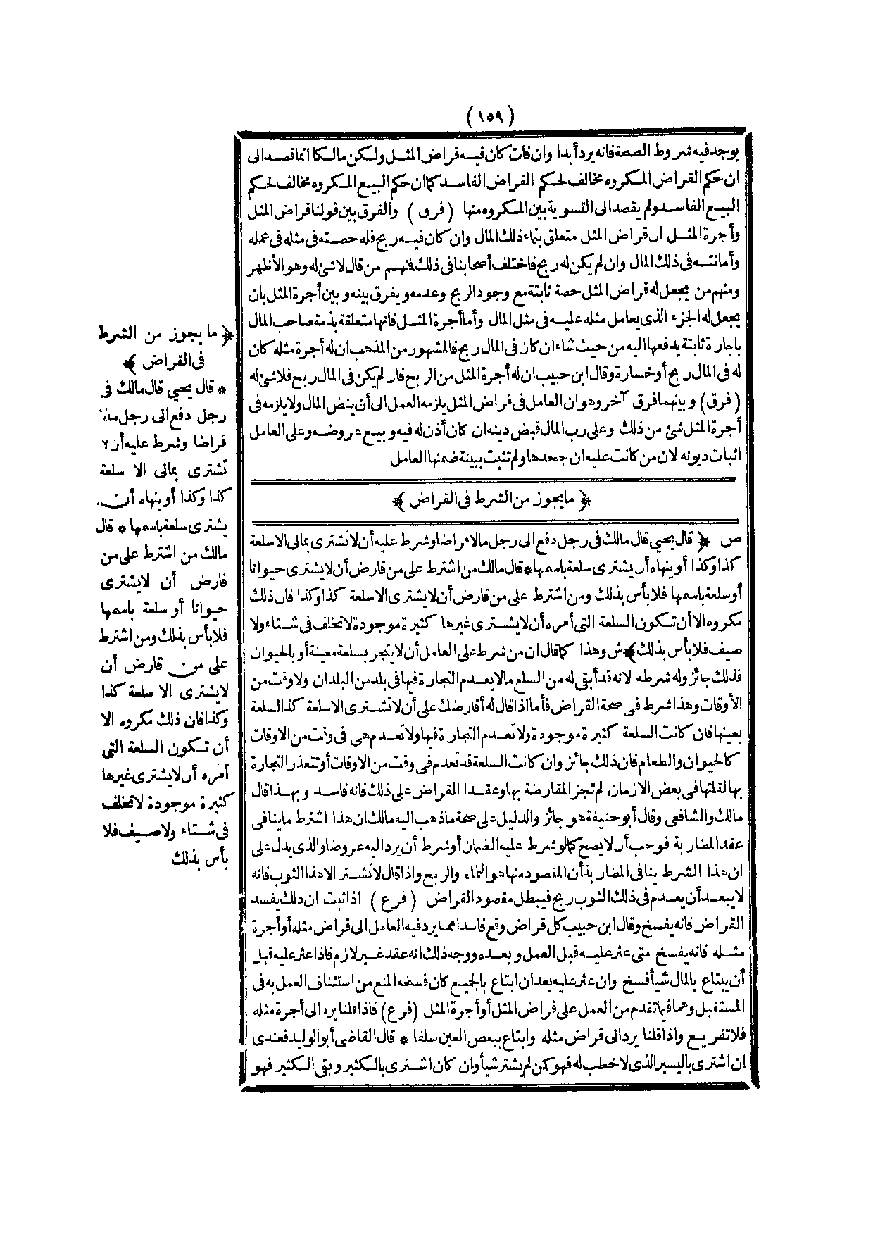 (ش) : وَهَذَا كَمَا قَالَ إنَّ مَنْ شَرَطَ عَلَى الْعَامِلِ أَنْ لَا يَتَّجِرَ بِسِلْعَةٍ مُعَيَّنَةٍ أَوْ بِالْحَيَوَانِ فَذَلِكَ جَائِزٌ وَلَهُ شَرْطُهُ؛ لِأَنَّهُ قَدْ أَبْقَى لَهُ مِنْ السِّلَعِ مَا لَا يُعْدَمُ التِّجَارَةُ فِيهَا فِي بَلَدٍ مِنْ الْبُلْدَانِ وَلَا وَقْتَ مِنْ الْأَوْقَاتِ، وَهَذَا شَرْطٌ فِي صِحَّةِ الْقِرَاضِ، فَأَمَّا إذَا قَالَ لَهُ أُقَارِضُك عَلَى أَنْ لَا تَشْتَرِيَ إلَّا سِلْعَةَ كَذَا السِّلْعَةَ بِعَيْنِهَا، فَإِنْ كَانَتْ السِّلْعَةُ كَثِيرَةً مَوْجُودَةً وَلَا تُعْدَمُ التِّجَارَةُ فِيهَا وَلَا تُعْدَمُ هِيَ فِي وَقْتٍ مِنْ الْأَوْقَاتِ كَالْحَيَوَانِ، وَالطَّعَامِ فَإِنَّ ذَلِكَ جَائِزٌ، وَإِنْ كَانَتْ السِّلْعَةُ قَدْ تَعْدَمُ فِي وَقْتٍ مِنْ الْأَوْقَاتِ أَوْ تَتَعَذَّرُ التِّجَارَةُ بِهَا لِقِلَّتِهَا فِي بَعْضِ الْأَزْمَانِ لَمْ تَجُزْ الْمُقَارَضَةُ بِهَا وَعَقْدُ الْقِرَاضِ عَلَى ذَلِكَ فَإِنَّهُ فَاسِدٌ وَبِهَذَا قَالَ مَالِكٌ وَالشَّافِعِيُّ.