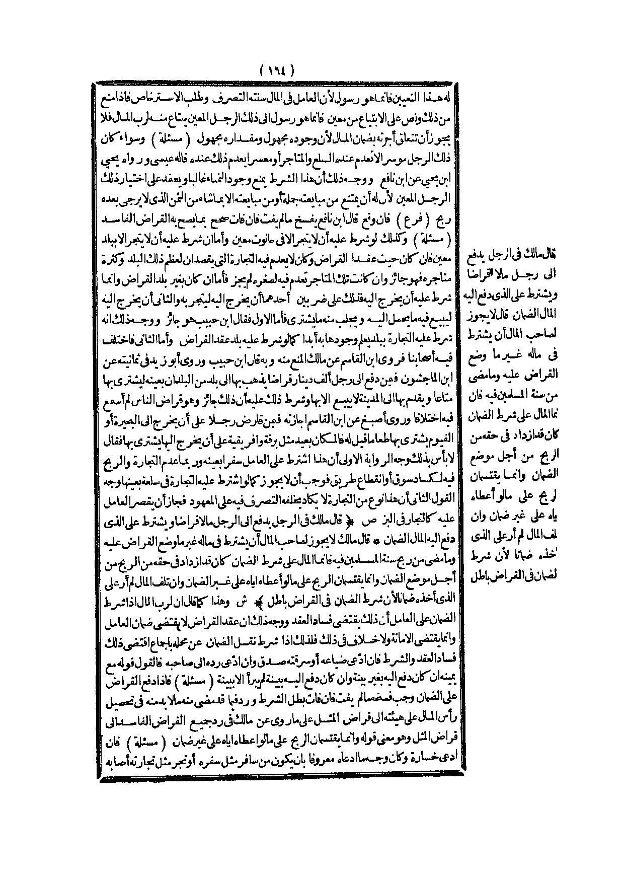 (ش) : وَهَذَا كَمَا قَالَ إنَّ لِرَبِّ الْمَالِ إذَا شَرَطَ الضَّمَانَ عَلَى الْعَامِلِ أَنَّ ذَلِكَ يَقْتَضِي فَسَادَ الْعَقْدِ، وَوَجْهُ ذَلِكَ أَنَّ عَقْدَ الْقِرَاضِ لَا يَقْتَضِي ضَمَانَ الْعَامِلِ، وَإِنَّمَا يَقْتَضِي الْأَمَانَةَ وَلَا خِلَافَ فِي ذَلِكَ فَلِذَلِكَ إذَا شَرَطَ نَقْلَ الضَّمَانِ عَنْ مَحَلِّهِ بِإِجْمَاعٍ اقْتَضَى ذَلِكَ فَسَادَ الْعَقْدِ وَالشَّرْطِ، فَإِنْ ادَّعَى ضَيَاعَهُ أَوْ سَرِقَتَهُ صُدِّقَ، وَإِنْ ادَّعَى رَدَّهُ إلَى صَاحِبِهِ فَالْقَوْلُ قَوْلُهُ مَعَ يَمِينِهِ إنْ كَانَ دَفَعَ إلَيْهِ بِغَيْرِ بَيِّنَةٍ، وَإِنْ كَانَ دَفَعَ إلَيْهِ بِبَيِّنَةٍ لَمْ يَبْرَأْ إلَّا بِبَيِّنَةٍ.