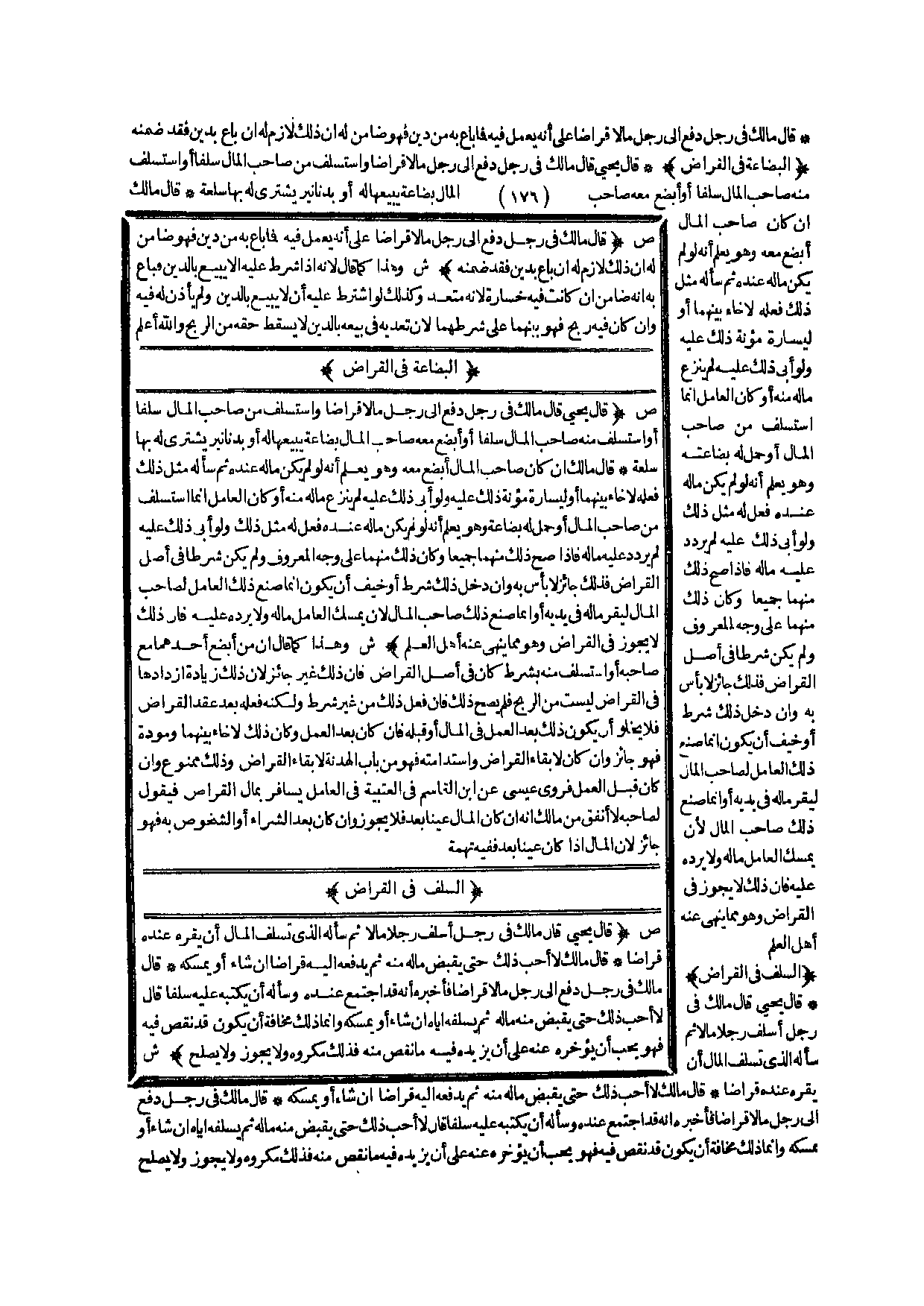 السَّلَفُ فِي الْقِرَاضِ (ص) : (قَالَ يَحْيَى قَالَ مَالِكٌ فِي رَجُلٍ أَسْلَفَ رَجُلًا مَالًا ثُمَّ سَأَلَهُ الَّذِي تَسَلَّفَ الْمَالَ أَنْ يُقِرَّهُ عِنْدَهُ قِرَاضًا قَالَ مَالِكٌ: لَا أُحِبُّ ذَلِكَ حَتَّى يَقْبِضَ مَالَهُ مِنْهُ ثُمَّ يَدْفَعَهُ إلَيْهِ قِرَاضًا إنْ شَاءَ أَوْ يُمْسِكَهُ قَالَ مَالِكٌ فِي رَجُلٍ دَفَعَ إلَى رَجُلٍ مَالًا قِرَاضًا فَأَخْبَرَهُ أَنَّهُ قَدْ اجْتَمَعَ عِنْدَهُ وَسَأَلَهُ أَنْ يَكْتُبَهُ عَلَيْهِ سَلَفًا قَالَ لَا أُحِبُّ ذَلِكَ حَتَّى يَقْبِضَ مِنْهُ مَالَهُ، ثُمَّ يُسَلِّفَهُ إيَّاهُ إنْ شَاءَ أَوْ يُمْسِكَهُ، وَإِنَّمَا ذَلِكَ مَخَافَةَ أَنْ يَكُونَ قَدْ نَقَصَ فِيهِ فَهُوَ يُحِبُّ أَنْ يُؤَخِّرَهُ عَنْهُ عَلَى أَنْ يَزِيدَهُ فِيهِ مَا نَقَصَ مِنْهُ فَذَلِكَ مَكْرُوهٌ وَلَا يَجُوزُ وَلَا يَصْلُحُ) .