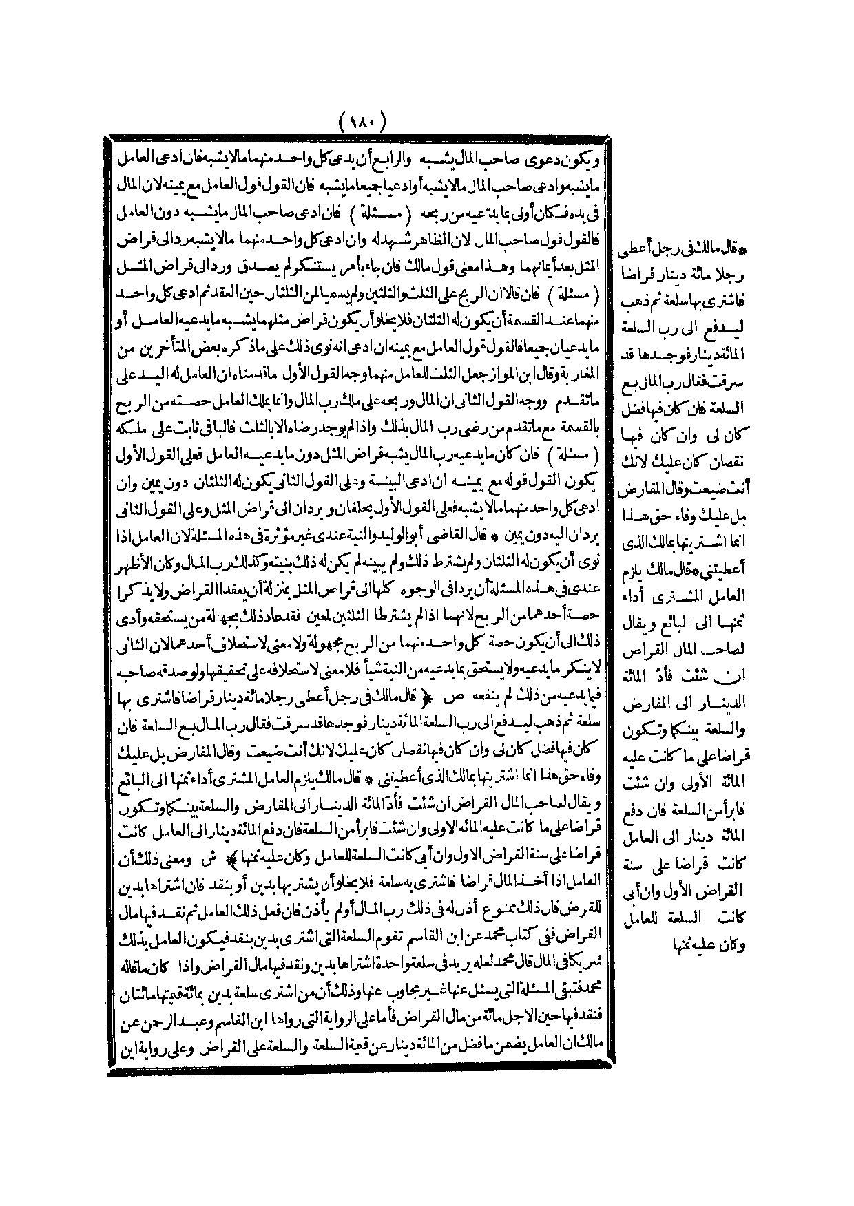 (ش) : وَمَعْنَى ذَلِكَ أَنَّ الْعَامِلَ إذَا أَخَذَ الْمَالَ قِرَاضًا فَاشْتَرَى بِهِ سِلْعَةً فَلَا يَخْلُو أَنْ يَشْتَرِيَهَا بِدَيْنٍ أَوْ بِنَقْدٍ، فَإِنْ اشْتَرَاهَا بِدَيْنٍ لِلْقَرْضِ فَإِنَّ ذَلِكَ مَمْنُوعٌ أَذِنَ لَهُ فِي ذَلِكَ رَبُّ الْمَالِ أَوْ لَمْ يَأْذَنْ، فَإِنْ فَعَلَ ذَلِكَ الْعَامِلُ ثُمَّ نَقَدَ فِيهَا مَالَ الْقِرَاضِ فَفِي كِتَابِ مُحَمَّدٍ عَنْ ابْنِ الْقَاسِمِ تُقَوَّمُ السِّلْعَةُ الَّتِي اشْتَرَى بِدَيْنٍ بِنَقْدٍ فَيَكُونُ الْعَامِلُ بِذَلِكَ شَرِيكًا فِي الْمَالِ قَالَ مُحَمَّدٌ لَعَلَّهُ يُرِيدُ فِي سِلْعَةٍ وَاحِدَةٍ اشْتَرَاهَا بِدَيْنٍ وَنَقَدَ فِيهَا مَالَ الْقِرَاضِ، وَإِذَا كَانَ مَا قَالَهُ مُحَمَّدٌ فَتَبْقَى الْمَسْأَلَةُ الَّتِي يُسْأَلُ عَنْهَا غَيْرَ مُجَاوَبٍ عَنْهَا، وَذَلِكَ أَنَّ مَنْ اشْتَرَى سِلْعَةً بِدَيْنٍ بِمِائَةٍ قِيمَتُهَا مِائَتَانِ فَنَقَدَ فِيهَا حِينَ الْأَجَلِ مِائَةً مِنْ مَالِ الْقِرَاضِ فَأَمَّا عَلَى الرِّوَايَةِ الَّتِي رَوَاهَا ابْنُ الْقَاسِمِ وَعَبْدُ الرَّحْمَنِ عَنْ مَالِكٍ أَنَّ الْعَامِلَ يَضْمَنُ مَا فَضَلَ مِنْ الْمِائَةِ دِينَارٍ عَنْ قِيمَةِ السِّلْعَةِ، وَالسِّلْعَةُ عَلَى الْقِرَاضِ، وَعَلَى رِوَايَةِ ابْنِ الْقَاسِمِ