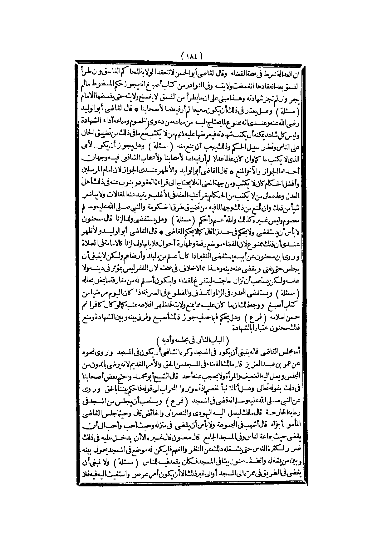 وَهَلْ يَجُوزُ أَنْ يَكُونَ الْأُمِّيُّ الَّذِي لَا يَكْتُبُ حَاكِمًا، وَإِنْ كَانَ عَالِمًا عَدْلًا؟ لَمْ أَرَ فِيهِ نَصًّا لِأَصْحَابِنَا، وَلِأَصْحَابِ الشَّافِعِيِّ فِيهِ وَجْهَانِ أَحَدُهُمَا الْجَوَازُ وَالْآخَرُ الْمَنْعُ قَالَ الْقَاضِي أَبُو الْوَلِيدِ وَالْأَظْهَرُ عِنْدِي الْجَوَازُ؛ لِأَنَّ إمَامَ الْمُرْسَلِينَ وَأَفْضَلَ الْحُكَّامِ كَانَ لَا يَكْتُبُ، وَمِنْ جِهَةِ الْمَعْنَى أَنَّهُ لَا يَحْتَاجُ إلَى قِرَاءَةِ الْعُقُودِ وَيَنُوبُ عَنْهُ فِي ذَلِكَ أَهْلُ الْعَدْلِ وَهَذِهِ حَالُ مَنْ لَا يَكْتُبُ مِنْ الْحُكَّامِ يُقْرَأُ عَلَيْهِ الْعَقْدُ فِي الْأَغْلَبِ وَيُقَيَّدُ عَنْهُ الْمَقَالَاتِ وَلَا يُبَاشِرُ شَيْئًا مِنْ ذَلِكَ، وَإِنَّ لِلْمَنْعِ مِنْ ذَلِكَ وَجْهًا لِمَا فِيهِ مِنْ تَضْيِيقِ طُرُقِ الْحُكُومَةِ وَالنَّبِيُّ - صَلَّى اللَّهُ عَلَيْهِ وَسَلَّمَ - مَعْصُومٌ وَلَيْسَ غَيْرُهُ كَذَلِكَ وَاَللَّهُ أَعْلَمُ وَأَحْكَمُ.
