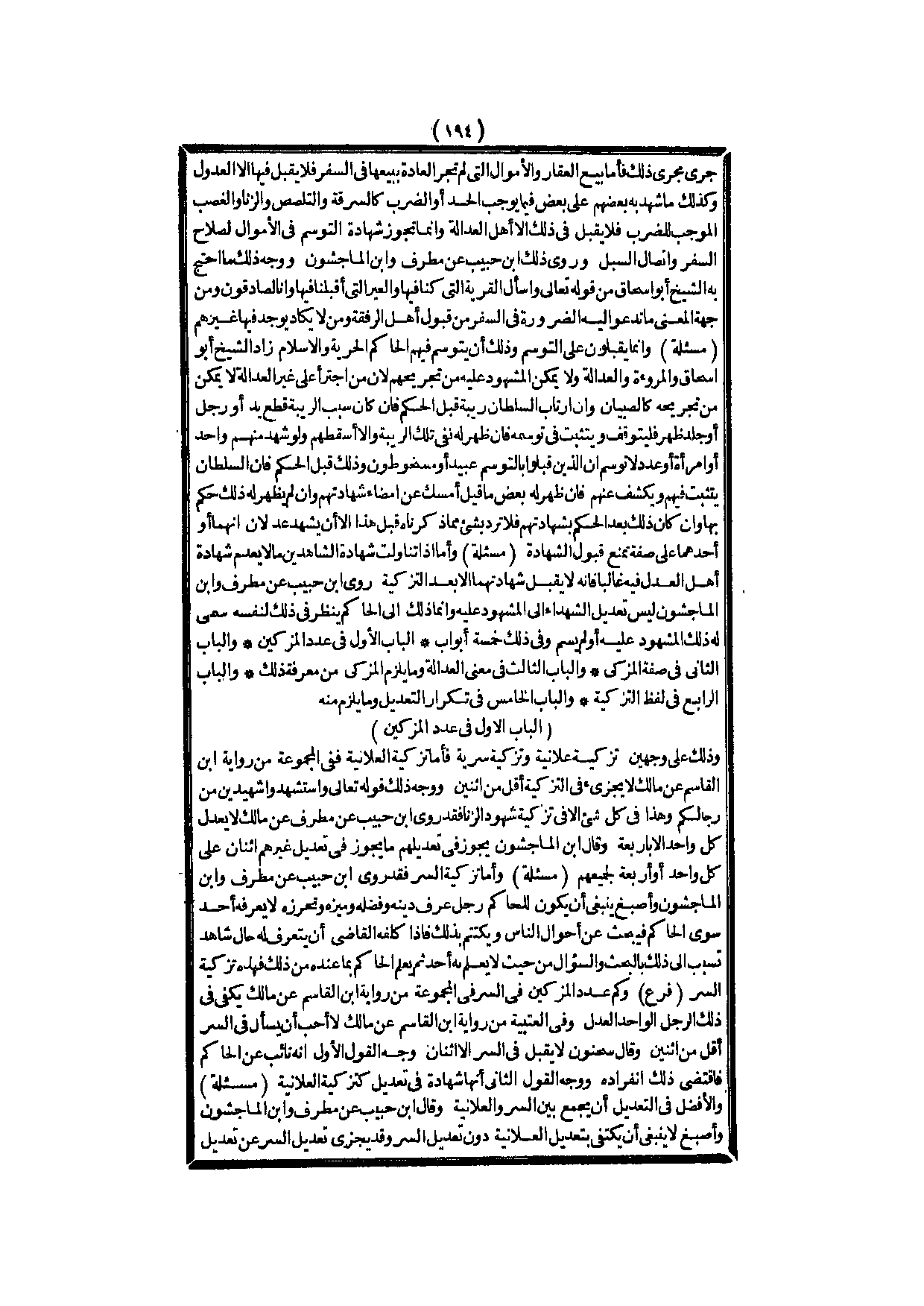 (الْبَابُ الْأَوَّلُ فِي عَدَدِ الْمُزَكِّينَ) وَذَلِكَ عَلَى وَجْهَيْنِ تَزْكِيَةٌ عَلَانِيَةٌ وَتَزْكِيَةٌ سِرِّيَّةٌ، فَأَمَّا تَزْكِيَةُ الْعَلَانِيَةِ فَفِي الْمَجْمُوعَةِ مِنْ رِوَايَةِ ابْنِ الْقَاسِمِ عَنْ مَالِكٍ لَا يُجْزِئُ فِي التَّزْكِيَةِ أَقَلُّ مِنْ اثْنَيْنِ، وَوَجْهُ ذَلِكَ قَوْله تَعَالَى {وَاسْتَشْهِدُوا شَهِيدَيْنِ مِنْ رِجَالِكُمْ} [البقرة: 282] وَهَذَا فِي كُلِّ شَيْءٍ إلَّا فِي تَزْكِيَةِ شُهُودِ الزِّنَا فَقَدْ رَوَى ابْنُ حَبِيبٍ عَنْ مُطَرِّفٍ عَنْ مَالِكٍ لَا يَعْدِلُ كُلُّ وَاحِدٍ إلَّا بِأَرْبَعَةٍ، وَقَالَ ابْنُ الْمَاجِشُونِ يَجُوزُ فِي تَعْدِيلِهِمْ مَا يَجُوزُ فِي تَعْدِيلِ غَيْرِهِمْ اثْنَانِ عَلَى كُلِّ وَاحِدٍ أَوْ أَرْبَعَةٌ لِجَمِيعِهِمْ.