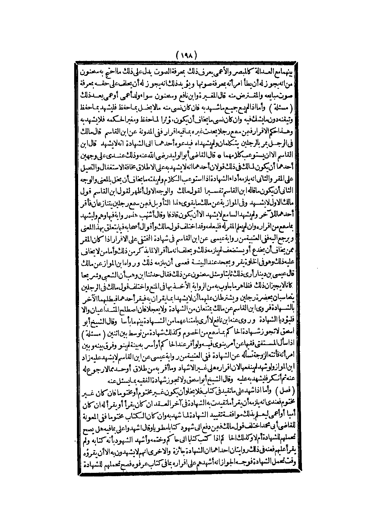 ـــــــــــــــــــــــــــــQبَيْنَهُمَا مَعَ الْعَدَالَةِ كَالْمُبْصِرِ وَالْأَعْمَى يَعْرِفُ ذَلِكَ بِمَعْرِفَةِ الصَّوْتِ يَدُلُّ عَلَى ذَلِكَ مَا احْتَجَّ بِهِ سَحْنُونٌ مِنْ أَنَّهُ يَجُوزُ لَهُ أَنْ يَطَأَ امْرَأَتَهُ بِمَعْرِفَةِ صَوْتِهَا وَيُؤَيِّدُ ذَلِكَ أَنَّهُ يَجُوزُ لَهُ أَنْ يَحْلِفَ عَلَى حَقِّهِ بِمَعْرِفَةِ صَوْتِ مُبَايِعِهِ وَالْمُقْتَرِضِ مِنْهُ قَالَ الْمُغِيرَةُ وَابْنُ نَافِعٍ وَسَحْنُونٌ سَوَاءٌ وُلِدَ أَعْمَى أَوْ عَمِيَ بَعْدَ ذَلِكَ.
