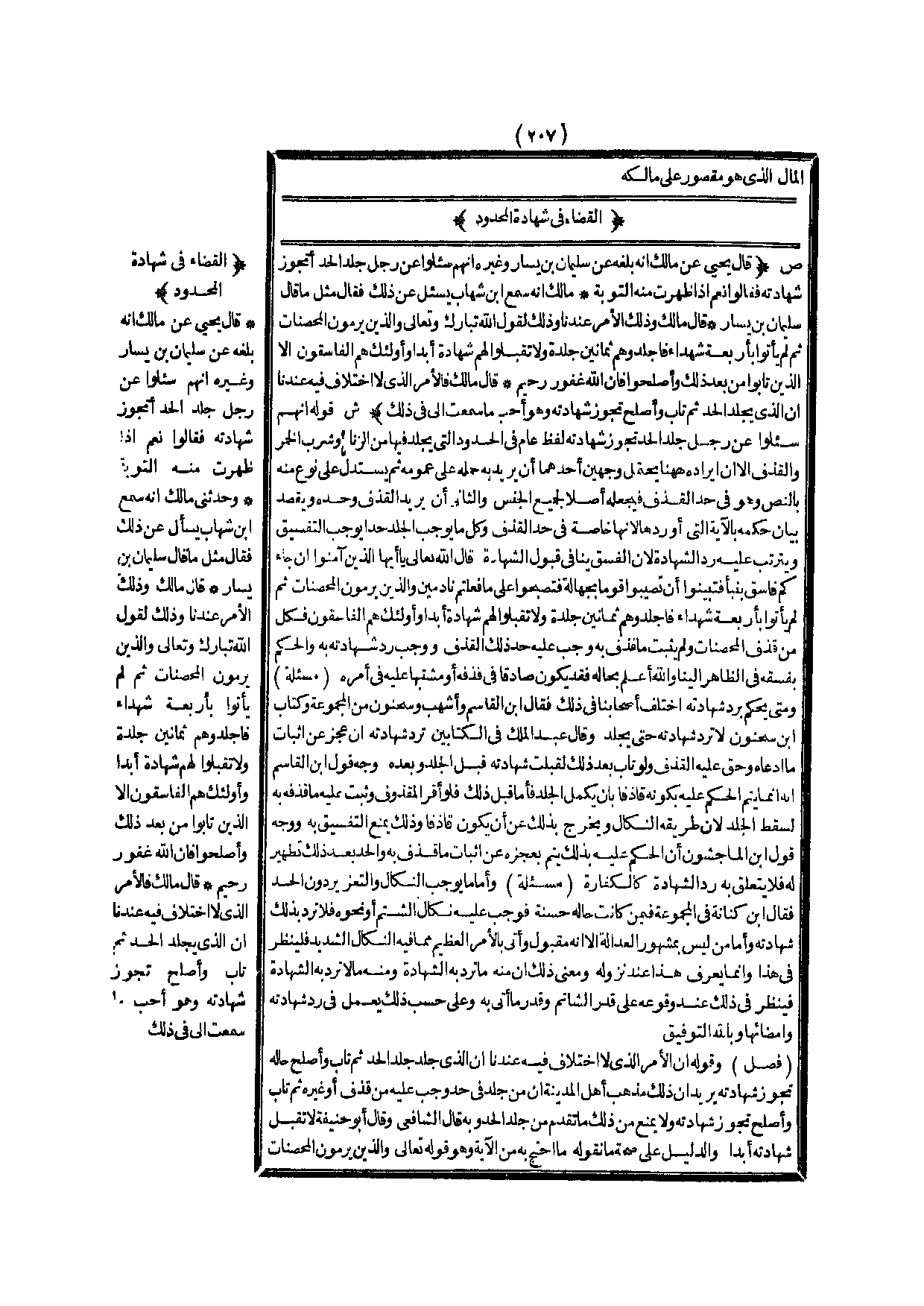 الْقَضَاءُ فِي شَهَادَةِ الْمَحْدُودِ (ص) : (قَالَ يَحْيَى عَنْ مَالِكٍ أَنَّهُ بَلَغَهُ عَنْ سُلَيْمَانَ بْنِ يَسَارٍ وَغَيْرِهِ أَنَّهُمْ سَأَلُوا عَنْ رَجُلٍ جُلِدَ الْحَدَّ أَتَجُوزُ شَهَادَتُهُ فَقَالُوا نَعَمْ إذَا ظَهَرَتْ مِنْهُ التَّوْبَةُ مَالِكٌ أَنَّهُ سَمِعَ ابْنَ شِهَابٍ يُسْأَلُ عَنْ ذَلِكَ فَقَالَ مِثْلَ مَا قَالَ سُلَيْمَانُ بْنُ يَسَارٍ قَالَ مَالِكٌ وَذَلِكَ الْأَمْرُ عِنْدَنَا وَذَلِكَ لِقَوْلِ اللَّهِ تَبَارَكَ وَتَعَالَى {وَالَّذِينَ يَرْمُونَ الْمُحْصَنَاتِ ثُمَّ لَمْ يَأْتُوا بِأَرْبَعَةِ شُهَدَاءَ فَاجْلِدُوهُمْ ثَمَانِينَ جَلْدَةً وَلا تَقْبَلُوا لَهُمْ شَهَادَةً أَبَدًا وَأُولَئِكَ هُمُ الْفَاسِقُونَ} [النور: 4] {إِلا الَّذِينَ تَابُوا مِنْ بَعْدِ ذَلِكَ وَأَصْلَحُوا فَإِنَّ اللَّهَ غَفُورٌ رَحِيمٌ} [النور: 5] قَالَ مَالِكٌ فَالْأَمْرُ الَّذِي لَا اخْتِلَافَ فِيهِ عِنْدَنَا أَنَّ الَّذِي يُجْلَدُ الْحَدَّ ثُمَّ تَابَ وَأَصْلَحَ تَجُوزُ شَهَادَتُهُ وَهُوَ أَحَبُّ مَا سَمِعْت إلَيَّ فِي ذَلِكَ) .