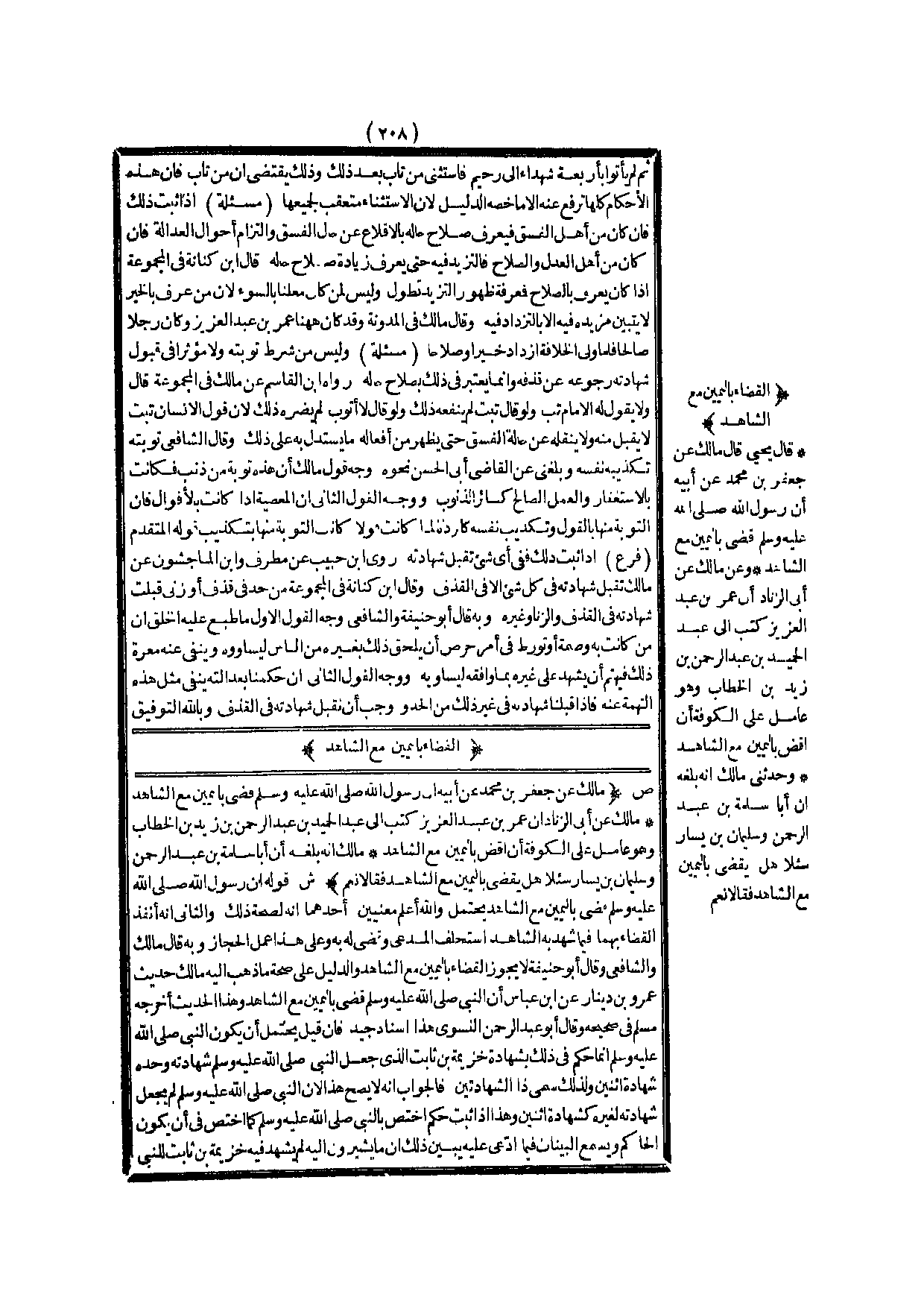 الْقَضَاءُ بِالْيَمِينِ مَعَ الشَّاهِدِ (ص) : (مَالِكٌ عَنْ جَعْفَرِ بْنِ مُحَمَّدٍ عَنْ أَبِيهِ «أَنَّ رَسُولَ اللَّهِ - صَلَّى اللَّهُ عَلَيْهِ وَسَلَّمَ - قَضَى بِالْيَمِينِ مَعَ الشَّاهِدِ» مَالِكٌ عَنْ أَبِي الزِّنَادِ أَنَّ عُمَرَ بْنَ عَبْدِ الْعَزِيزِ كَتَبَ إلَى عَبْدِ الْحَمِيدِ بْنِ عَبْدِ الرَّحْمَنِ بْنِ زَيْدِ بْنِ الْخَطَّابِ وَهُوَ عَامِلٌ عَلَى الْكُوفَةِ أَنْ اقْضِ بِالْيَمِينِ مَعَ الشَّاهِدِ مَالِكٌ أَنَّهُ بَلَغَهُ أَنَّ أَبَا سَلَمَةَ بْنَ عَبْدِ الرَّحْمَنِ وَسُلَيْمَانَ بْنَ يَسَارٍ سُئِلَا هَلْ يُقْضَى بِالْيَمِينِ مَعَ الشَّاهِدِ فَقَالَا نَعَمْ)