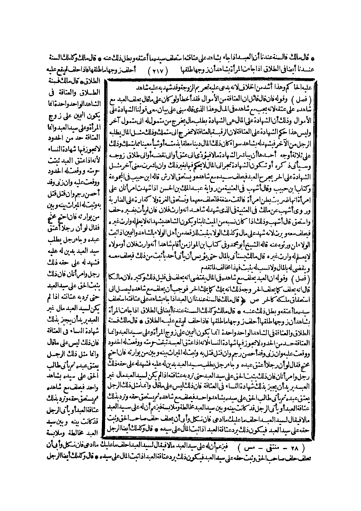 (ص) : (قَالَ مَالِكٌ فَالسُّنَّةُ عِنْدَنَا أَنَّ الْعَبْدَ إذَا جَاءَ بِشَاهِدٍ عَلَى عَتَاقَتِهِ اُسْتُحْلِفَ سَيِّدُهُ مَا أَعْتَقَهُ وَبَطَلَ ذَلِكَ عَنْهُ قَالَ مَالِكٌ، وَكَذَلِكَ السُّنَّةُ عِنْدَنَا أَيْضًا فِي الطَّلَاقِ إذَا جَاءَتْ الْمَرْأَةُ بِشَاهِدٍ أَنَّ زَوْجَهَا طَلَّقَهَا أُحْلِفَ زَوْجُهَا مَا طَلَّقَهَا فَإِذَا حَلَفَ لَمْ يَقَعْ عَلَيْهِ الطَّلَاقُ قَالَ مَالِكٌ فَسُنَّةُ الطَّلَاقِ وَالْعَتَاقَةِ فِي الشَّاهِدِ الْوَاحِدِ وَاحِدَةٌ إنَّمَا يَكُونُ الْيَمِينُ عَلَى زَوْجِ الْمَرْأَةِ وَعَلَى سَيِّدِ الْعَبْدِ، وَإِنَّمَا الْعَتَاقَةُ حَدٌّ مِنْ الْحُدُودِ لَا تَجُوزُ فِيهَا شَهَادَةُ النِّسَاءِ؛ لِأَنَّهُ إذَا عَتَقَ الْعَبْدُ ثَبَتَتْ حُرْمَتُهُ وَوَقَعَتْ لَهُ الْحُدُودُ وَوَقَعَتْ عَلَيْهِ، وَإِنْ زَنَى، وَقَدْ أَحْصَنَ رُجِمَ، وَإِنْ قَتَلَ قُتِلَ بِهِ وَثَبَتَ لَهُ الْمِيرَاثُ بَيْنَهُ وَبَيْنَ مَنْ يُوَارِثُهُ.
