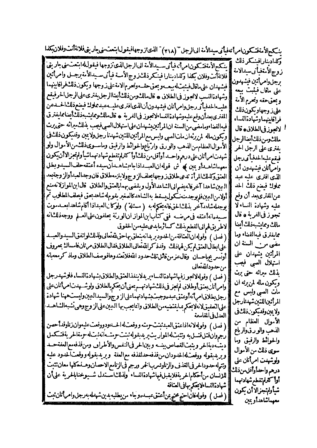 ـــــــــــــــــــــــــــــQيَنْكِحُ الْأَمَةَ فَتَكُونُ امْرَأَتَهُ فَيَأْتِي سَيِّدُ الْأَمَةِ إلَى الرَّجُلِ الَّذِي تَزَوَّجَهَا فَيَقُولُ لَهُ ابْتَعْت مِنِّي جَارِيَتِي فُلَانَةَ أَنْتَ وَفُلَانٌ بِكَذَا وَكَذَا دِينَارًا فَيُنْكِرُ ذَلِكَ زَوْجُ الْأَمَةِ فَيَأْتِي سَيِّدُ الْأَمَةِ بِرَجُلٍ وَامْرَأَتَيْنِ فَيَشْهَدَانِ عَلَى مَا قَالَ فَيَثْبُتُ لَهُ بَيْعُهُ وَيَحِقُّ حَقُّهُ وَتَحْرُمُ الْأَمَةُ عَلَى زَوْجِهَا وَيَكُونُ ذَلِكَ فِرَاقًا بَيْنَهُمَا وَشَهَادَةُ النَّسَبِ لَا تَجُوزُ فِي الطَّلَاقِ قَالَ مَالِكٌ وَمِنْ ذَلِكَ أَيْضًا الرَّجُلُ يَفْتَرِي عَلَى الرَّجُلِ الْحُرِّ فَيَقَعُ عَلَيْهِ الْحَدُّ فَيَأْتِي رَجُلٌ وَامْرَأَتَانِ فَيَشْهَدُونَ أَنَّ الَّذِي افْتَرَى عَلَيْهِ عَبْدٌ مَمْلُوكٌ فَيَضَعُ ذَلِكَ الْحَدَّ عَنْ الْمُفْتَرِي بَعْدَ أَنْ وَقَعَ عَلَيْهِ، وَشَهَادَةُ النِّسَاءِ لَا تَجُوزُ فِي الْفِرْيَةِ قَالَ مَالِكٌ وَمِمَّا يُشْبِهُ ذَلِكَ أَيْضًا مِمَّا يَفْتَرِقُ فِيهِ الْقَضَاءُ وَمَا مَضَى مِنْ السُّنَّةِ أَنَّ الْمَرْأَتَيْنِ يَشْهَدَانِ عَلَى اسْتِهْلَالِ الصَّبِيِّ فَيَجِبُ بِذَلِكَ مِيرَاثُهُ حَتَّى يَرِثَ وَيَكُونُ مَالُهُ لِمَنْ يَرِثُهُ إنْ مَاتَ الصَّبِيُّ وَلَيْسَ مَعَ الْمَرْأَتَيْنِ اللَّتَيْنِ شَهِدَتَا رَجُلٌ وَلَا يَمِينٌ، وَقَدْ يَكُونُ ذَلِكَ فِي الْأَمْوَالِ الْعِظَامِ مِنْ الذَّهَبِ وَالْوَرِقِ وَالرِّبَاعِ وَالْحَوَائِطِ وَالرَّقِيقِ وَمَا سِوَى ذَلِكَ مِنْ الْأَمْوَالِ، وَلَوْ شَهِدَتْ امْرَأَتَانِ عَلَى دِرْهَمٍ وَاحِدٍ أَوْ أَقَلَّ مِنْ ذَلِكَ أَوْ أَكْثَرَ لَمْ تَقْطَعْ شَهَادَتُهُمَا شَيْئًا وَلَمْ تَجُزْ إلَّا أَنْ يَكُونَ مَعَهُمَا شَاهِدٌ أَوْ يَمِينٌ) .