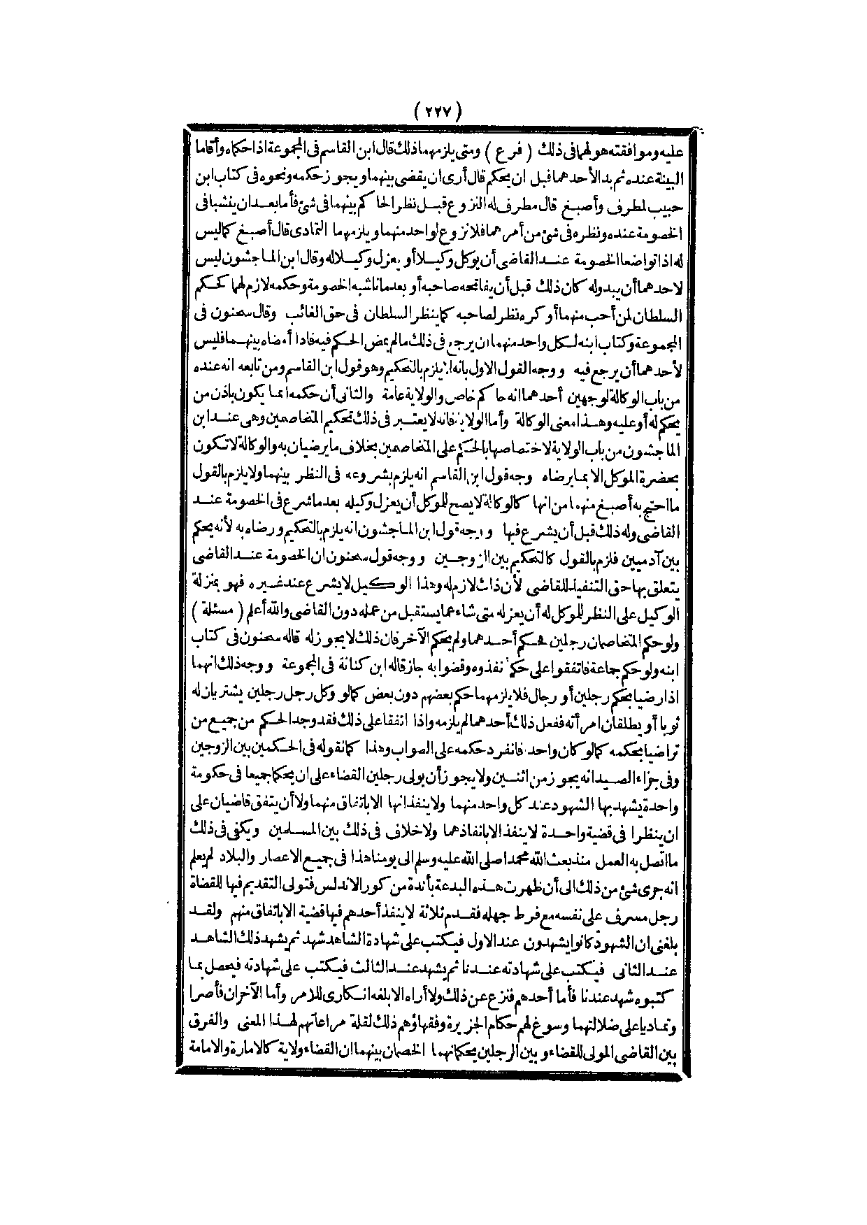 وَيَكْفِي فِي ذَلِكَ مَا اتَّصَلَ بِهِ الْعَمَلُ مُنْذُ بَعَثَ اللَّهُ مُحَمَّدًا - صَلَّى اللَّهُ عَلَيْهِ وَسَلَّمَ - إلَى يَوْمِنَا هَذَا فِي جَمِيعِ الْأَعْصَارِ وَالْبِلَادِ لَمْ يُعْلَمْ أَنَّهُ جَرَى شَيْءٌ مِنْ ذَلِكَ إلَى أَنْ ظَهَرَتْ هَذِهِ الْبِدْعَةُ بِأُنْدَةَ مِنْ كُوَرِ الْأَنْدَلُسِ فَتَوَلَّى التَّقْدِيمَ فِيهَا لِلْقُضَاةِ رَجُلٌ مُسْرِفٌ عَلَى نَفْسِهِ مَعَ فَرْطِ جَهْلِهِ فَقَدَّمَ ثَلَاثَةً لَا يُنَفِّذُ أَحَدُهُمْ فِيهَا قَضِيَّةً إلَّا بِاتِّفَاقٍ مِنْهُمْ، وَلَقَدْ بَلَغَنِي أَنَّ الشُّهُودَ كَانُوا يَشْهَدُونَ عِنْدَ الْأَوَّلِ فَيَكْتُبُ عَلَى شَهَادَةِ الشَّاهِدِ شَهِدَ ثُمَّ يَشْهَدُ ذَلِكَ الشَّاهِدُ عِنْدَ الثَّانِي فَيَكْتُبُ عَلَى شَهَادَتِهِ عِنْدَنَا ثُمَّ يَشْهَدُ عِنْدَ الثَّالِثِ فَيَكْتُبُ عَلَى شَهَادَتِهِ فَيَحْصُلُ بِمَا كَتَبُوهُ شَهِدَ عِنْدَنَا فَأَمَّا أَحَدُهُمْ فَنُزِعَ عَنْ ذَلِكَ، وَلَا أَرَاهُ إلَّا بَلَغَهُ إنْكَارِي لِلْأَمْرِ، وَأَمَّا الْآخَرَانِ فَأَصَرَّا وَتَمَادَيَا عَلَى ضَلَالَتِهِمَا وَسَوَّغَ لَهُمْ حُكَّامُ الْجَزِيرَةِ، وَفُقَهَاؤُهُمْ ذَلِكَ لِقِلَّةِ مُرَاعَاتِهِمْ لِهَذَا الْمَعْنَى وَالْفَرْقُ بَيْنَ الْقَاضِي الْمُوَلَّى لِلْقَضَاءِ، وَبَيْنَ الرَّجُلَيْنِ يُحَكِّمَانِهِمَا الْخَصْمَانِ بَيْنَهُمَا أَنَّ الْقَضَاءَ وِلَايَةٌ كَالْإِمَارَةِ وَالْإِمَامَةِ