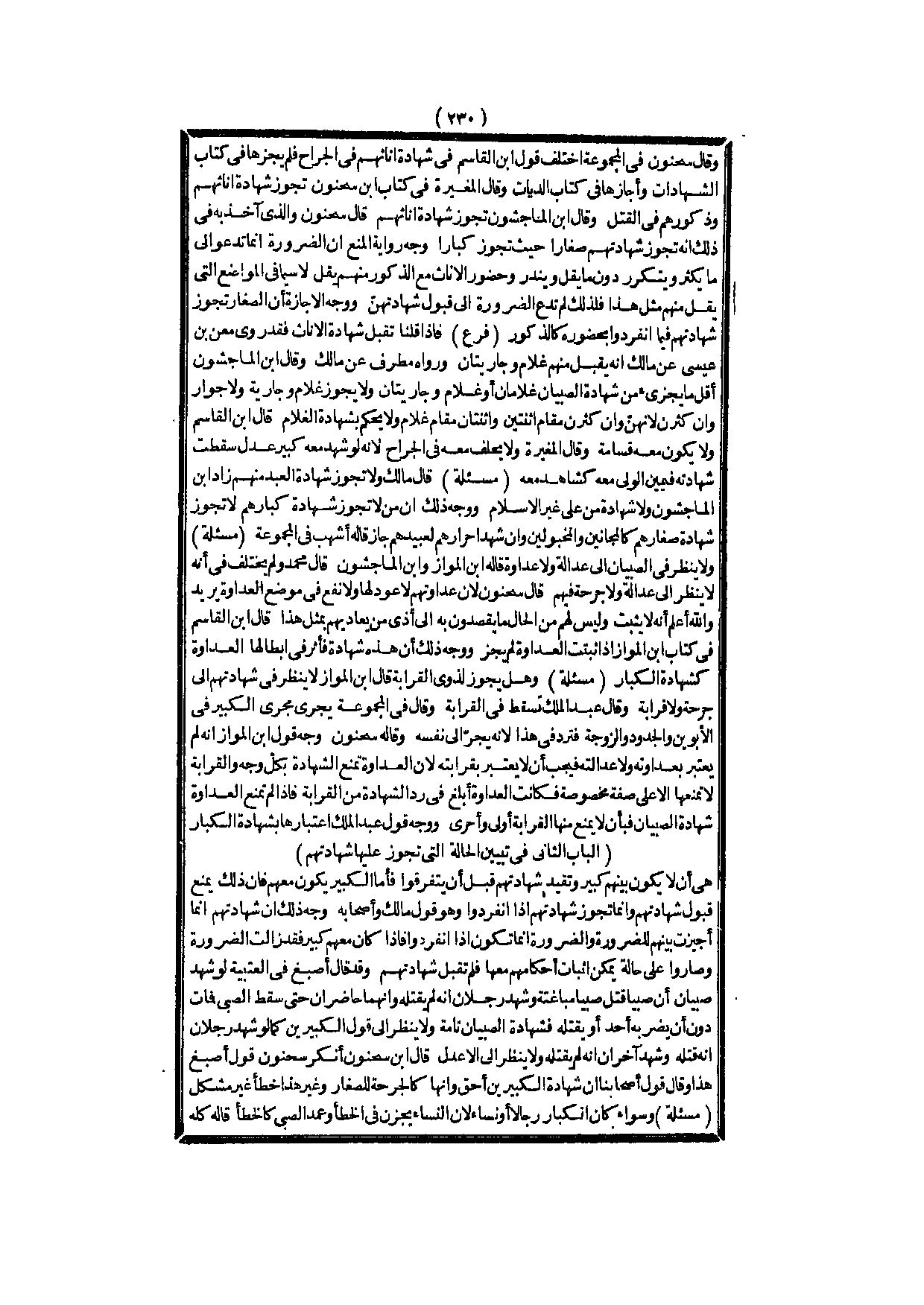 ـــــــــــــــــــــــــــــQوَقَالَ سَحْنُونٍ فِي الْمَجْمُوعَةِ اخْتَلَفَ قَوْلُ ابْنِ الْقَاسِمِ فِي شَهَادَةِ إنَاثِهِمْ فِي الْجِرَاحِ فَلَمْ يُجِزْهَا فِي كِتَابِ الشَّهَادَاتِ، وَأَجَازَهَا فِي كِتَابِ الدِّيَاتِ.