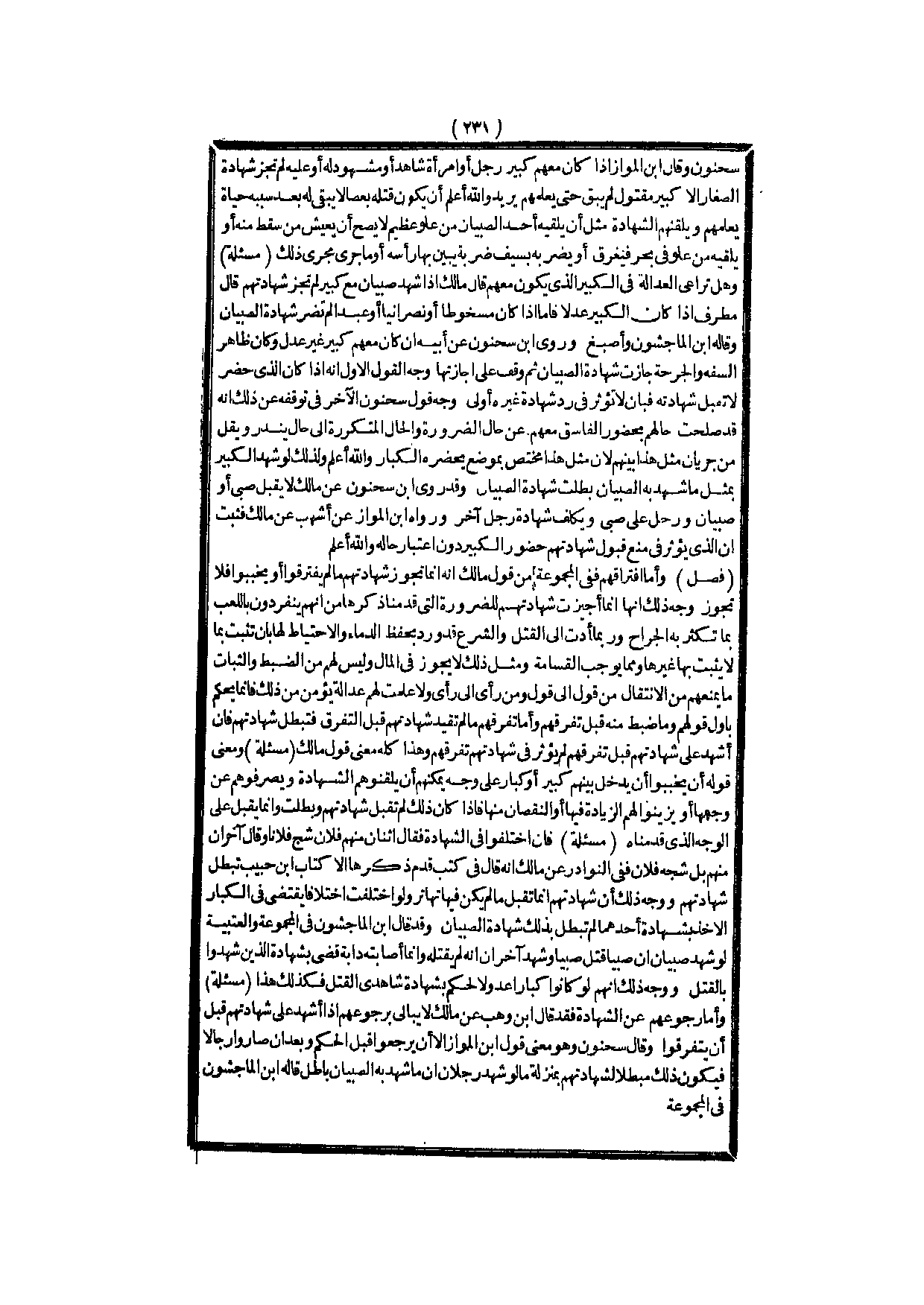 وَقَدْ رَوَى ابْنُ سَحْنُونٍ عَنْ مَالِكٍ لَا يُقْبَلُ صَبِيٌّ أَوْ صَبِيَّانِ وَرَجُلٌ عَلَى صَبِيٍّ، وَيُكَلَّفُ شَهَادَةَ رَجُلٍ آخَرَ وَرَوَاهُ ابْنُ الْمَوَّازِ عَنْ أَشْهَبَ عَنْ مَالِكٍ فَثَبَتَ أَنَّ الَّذِي يُؤَثِّرُ فِي مَنْعِ قَبُولِ شَهَادَتِهِمْ حُضُورُ الْكَبِيرِ دُونَ اعْتِبَارِ حَالِهِ، وَاَللَّهُ أَعْلَمُ.