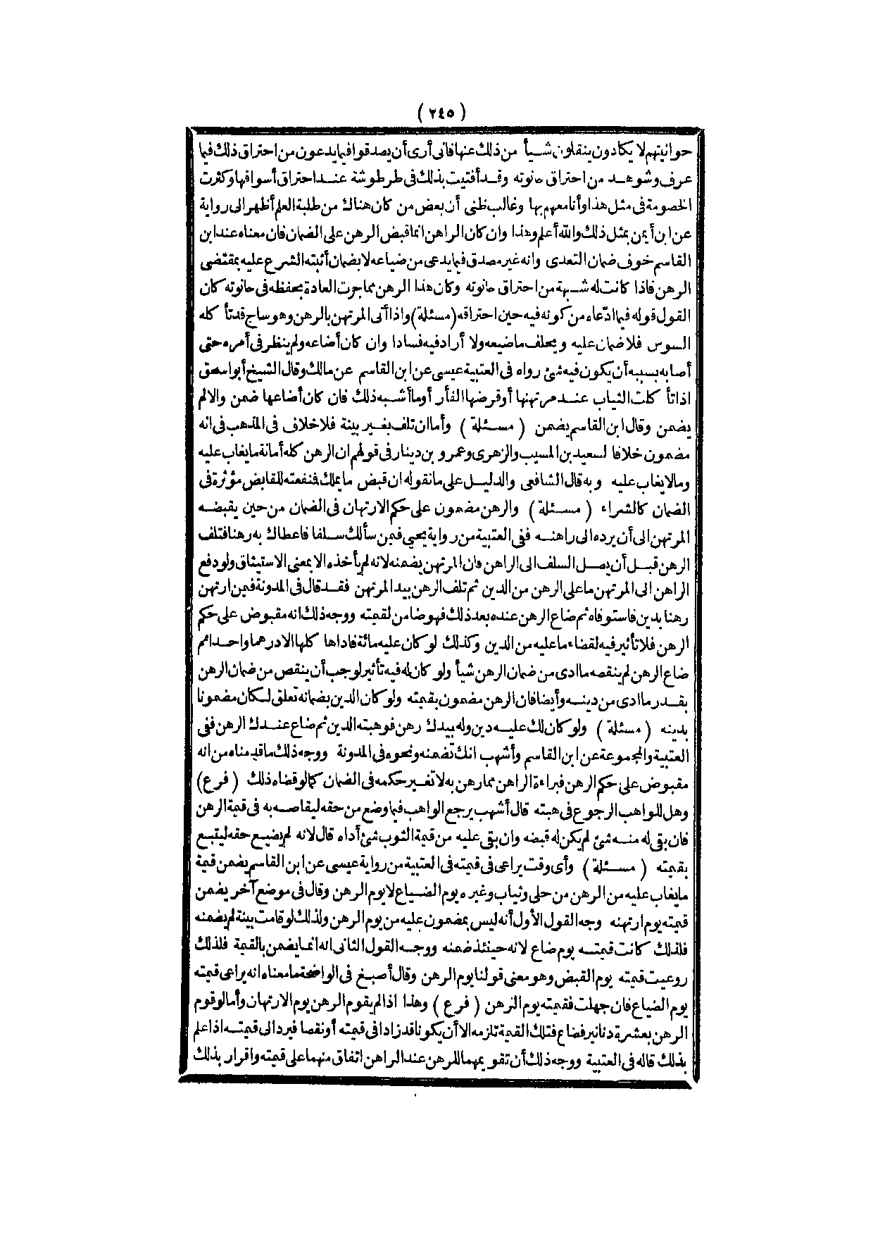 ـــــــــــــــــــــــــــــQحَوَانِيتِهِمْ لَا يَكَادُونَ يَنْقُلُونَ شَيْئًا مِنْ ذَلِكَ عَنْهَا فَإِنِّي أَرَى أَنْ يُصَدَّقُوا فِيمَا يَدَّعُونَ مِنْ احْتِرَاقِ ذَلِكَ فِيمَا عُرِفَ وَشُوهِدَ مِنْ احْتِرَاقِ حَانُوتِهِ، وَقَدْ أَفْتَيْتُ بِذَلِكَ فِي طَرْطُوشَةَ عِنْدَ احْتِرَاقِ أَسْوَاقِهَا وَكَثُرَتْ الْخُصُومَةُ فِي مِثْلِ هَذَا، وَأَنَا مَعَهُمْ بِهَا وَغَالِبُ ظَنِّي أَنَّ بَعْضَ مَنْ كَانَ هُنَاكَ مِنْ طَلَبَةِ الْعِلْمِ أَظْهَرَ إلَيَّ رِوَايَةً عَنْ ابْنِ أَيْمَنَ بِمِثْلِ ذَلِكَ، وَاَللَّهُ أَعْلَمُ وَهَذَا وَإِنْ كَانَ الرَّاهِنُ إنَّمَا قَبَضَ الرَّهْنَ عَلَى الضَّمَانِ فَإِنَّ مَعْنَاهُ عِنْدَ ابْنِ الْقَاسِمِ خَوْفُ ضَمَانِ التَّعَدِّي، وَأَنَّهُ غَيْرُ مُصَدَّقٍ فِيمَا يَدَّعِي مِنْ ضَيَاعِهِ لَا بِضَمَانٍ أَثْبَتَهُ الشَّرْعُ عَلَيْهِ بِمُقْتَضَى الرَّهْنِ فَإِذَا كَانَتْ لَهُ شُبْهَةٌ مِنْ احْتِرَاقِ حَانُوتِهِ وَكَانَ هَذَا الرَّهْنُ مِمَّا جَرَتْ الْعَادَةُ بِحِفْظِهِ فِي حَانُوتِهِ كَانَ الْقَوْلُ قَوْلَهُ فِيمَا ادَّعَاهُ مِنْ كَوْنِهِ فِيهِ حِينَ احْتِرَاقِهِ.