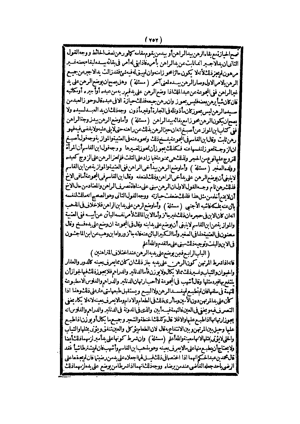 (الْبَابُ الرَّابِعُ فِيمَنْ يُوضَعُ عَلَى يَدَيْهِ الرَّهْنُ عِنْدَ اخْتِلَافِ الْمُتَرَاهِنَيْنِ) فَإِنَّهُ إذَا شَرَطَ الْمُرْتَهِنُ كَوْنَ الرَّهْنِ عَلَى يَدَيْهِ جَازَ ذَلِكَ إنْ كَانَ مِمَّا يُعْرَفُ بِعَيْنِهِ كَالدُّورِ وَالْعَقَارِ وَالْحَيَوَانِ وَالثِّيَابِ وَغَيْرِ ذَلِكَ مِمَّا لَا يُكَالُ، وَلَا يُوزَنُ، فَأَمَّا الدَّنَانِيرُ وَالدَّرَاهِمُ فَلَا يَجُوزُ ذَلِكَ فِيهَا؛ لِجَوَازِ أَنْ يَنْتَفِعَ بِهَا فَيَرُدَّ مِثْلَهَا.