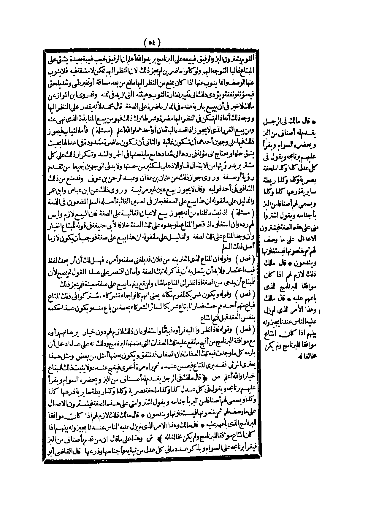 (ص) : (قَالَ مَالِكٌ فِي الرَّجُلِ يُقَدَّمُ لَهُ أَصْنَافٌ مِنْ الْبَزِّ، وَيَحْضُرُهُ السَّوَامُّ، وَيَقْرَأُ عَلَيْهِمْ بَرْنَامَجَه، وَيَقُولُ فِي كُلِّ عِدْلِ كَذَا وَكَذَا مِلْحَفَةٌ بَصْرِيَّةٌ وَكَذَا وَكَذَا رَيْطَةً سَابِرِيَّةً ذَرْعُهَا كَذَا وَكَذَا، وَيُسَمِّي لَهُمْ أَصْنَافًا مِنْ الْبَزِّ بِأَجْنَاسِهِ وَيَقُولُ اشْتَرُوا مِنِّي عَلَى هَذِهِ الصِّفَةِ فَيَشْتَرُونَ الْأَعْدَالَ عَلَى مَا وَصَفَ لَهُمْ ثُمَّ يَفْتَحُونَهَا فَيَسْتَغِلُّونَهَا وَيَنْدَمُونَ قَالَ مَالِكٌ ذَلِكَ لَازِمٌ لَهُمْ إذَا كَانَ مُوَافِقًا لِلْبَرْنَامَجِ الَّذِي بَاعَهُمْ عَلَيْهِ قَالَ مَالِكٌ، وَهَذَا الْأَمْرُ الَّذِي لَمْ يَزَلْ عَلَيْهِ النَّاسُ عِنْدَنَا يُجِيزُونَهُ بَيْنَهُمْ إذَا كَانَ الْمَتَاعُ مُوَافِقًا لِلْبَرْنَامَجِ، وَلَمْ يَكُنْ مُخَالِفًا لَهُ) .