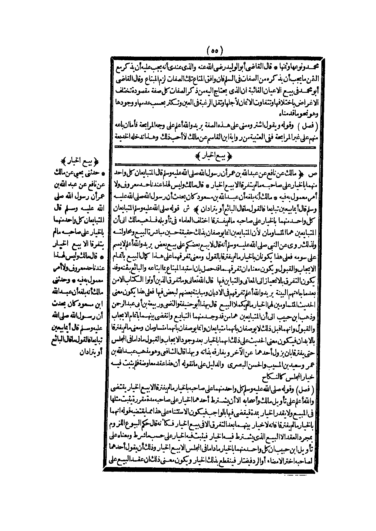 (بَيْعُ الْخِيَارِ) (ص) : (مَالِكٌ عَنْ نَافِعٍ عَنْ عَبْدِ اللَّهِ بْنِ عُمَرَ أَنَّ رَسُولَ اللَّهِ - صَلَّى اللَّهُ عَلَيْهِ وَسَلَّمَ - قَالَ «الْمُتَبَايِعَانِ كُلُّ وَاحِدٍ مِنْهُمَا بِالْخِيَارِ عَلَى صَاحِبِهِ مَا لَمْ يَتَفَرَّقَا إلَّا بَيْعَ الْخِيَارِ» قَالَ مَالِكٌ وَلَيْسَ لِهَذَا عِنْدَنَا حَدٌّ مَعْرُوفٌ، وَلَا أَمْرٌ مَعْمُولٌ بِهِ فِيهِ مَالِكٌ أَنَّهُ بَلَغَهُ أَنَّ عَبْدَ اللَّهِ بْنَ مَسْعُودٍ كَانَ يُحَدِّثُ أَنَّ رَسُولَ اللَّهِ - صَلَّى اللَّهُ عَلَيْهِ وَسَلَّمَ - قَالَ «أَيُّمَا بَيْعَيْنِ تَبَايَعَا فَالْقَوْلُ مَا قَالَ الْبَائِعُ أَوْ يَتَرَادَّانِ» )