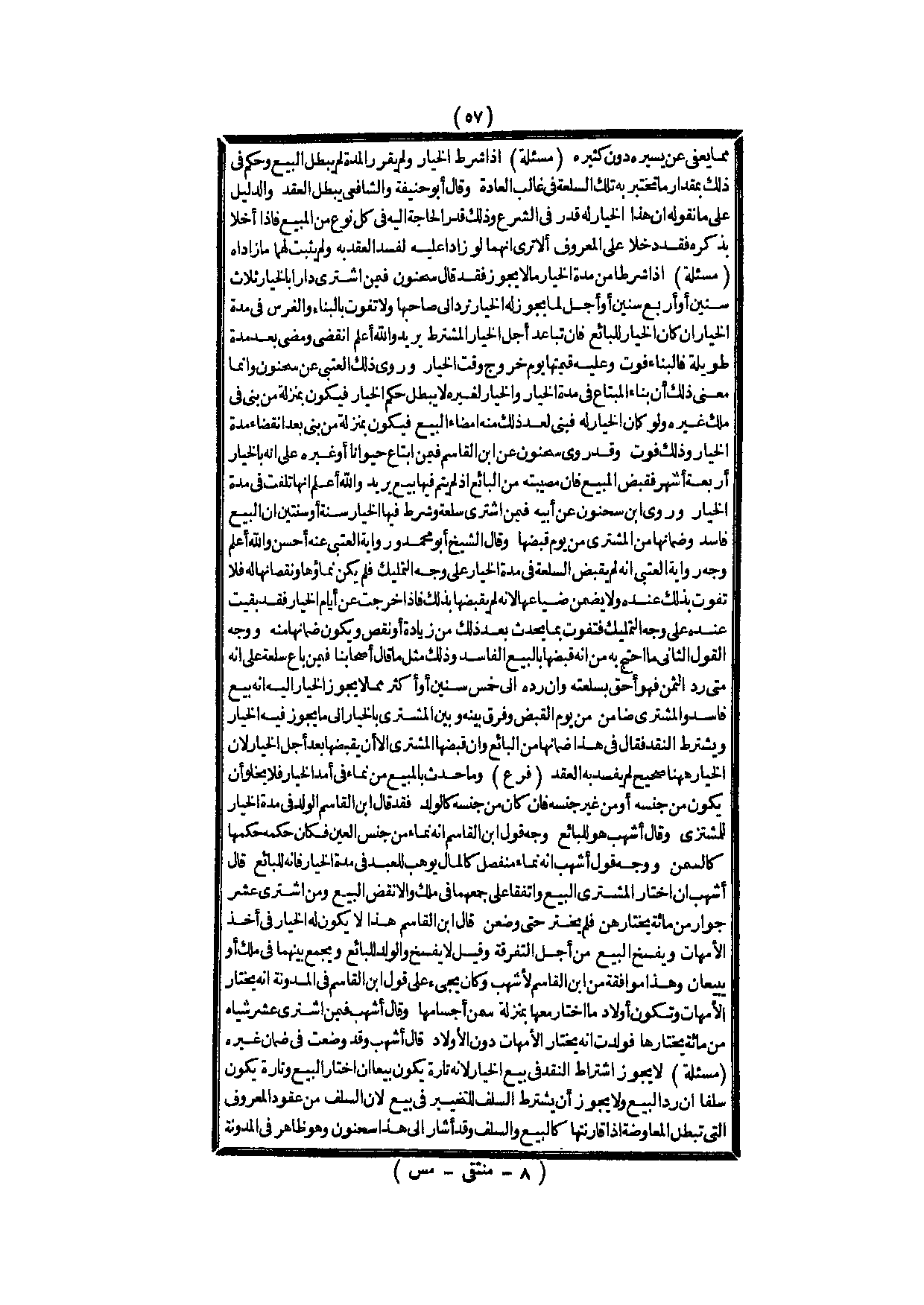 (فَرْعٌ) ، وَمَا حَدَثَ بِالْمَبِيعِ مِنْ نَمَاءٍ فِي أَمَدِ الْخِيَارِ فَلَا يَخْلُو أَنْ يَكُونَ مِنْ جِنْسِهِ أَوْ مِنْ غَيْرِ جِنْسِهِ فَإِنْ كَانَ مِنْ جِنْسِهِ كَالْوَلَدِ فَقَدْ قَالَ ابْنُ الْقَاسِمِ الْوَلَدُ فِي مُدَّةِ الْخِيَارِ لِلْمُشْتَرِي، وَقَالَ أَشْهَبُ هُوَ لِلْبَائِعِ وَجْهُ قَوْلِ ابْنِ الْقَاسِمِ إنَّهُ نَمَاءٌ مِنْ جِنْسِ الْعَيْنِ فَكَانَ حُكْمُهُ حُكْمَهَا كَالسَّمْنِ، وَوَجْهُ قَوْلِ أَشْهَبَ إنَّهُ نَمَاءٌ مُنْفَصِلٌ كَالْمَالِ يُوهَبُ لِلْعَبْدِ فِي مُدَّةِ الْخِيَارِ فَإِنَّهُ لِلْبَائِعِ قَالَ أَشْهَبُ إنْ اخْتَارَ الْمُشْتَرِي الْبَيْعَ، وَاتَّفَقَا عَلَى جَمْعِهِمَا فِي مِلْكٍ، وَإِلَّا نُقِضَ الْبَيْعُ، وَمَنْ اشْتَرَى عَشْرَ جِوَارٍ مِنْ مِائَةٍ يَخْتَارُهُنَّ فَلَمْ يَخْتَرْ حَتَّى وَضَعْنَ قَالَ ابْنُ الْقَاسِمِ هَذَا لَا يَكُونُ لَهُ الْخِيَارُ فِي أَخْذِ الْأُمَّهَاتِ، وَيُفْسَخُ الْبَيْعُ مِنْ أَجْلِ التَّفْرِقَةِ، وَقِيلَ لَا يُفْسَخُ، وَالْوَلَدُ لِلْبَائِعِ، وَيُجْمَعُ بَيْنَهُمَا فِي مِلْكٍ أَوْ يَبِيعَانِ، وَهَذَا مُوَافَقَةٌ مِنْ ابْنِ الْقَاسِمِ لِأَشْهَبَ، وَكَانَ يَجِيءُ عَلَى قَوْلِ ابْنِ الْقَاسِمِ فِي الْمُدَوَّنَةِ إنَّهُ يَخْتَارُ الْأُمَّهَاتِ، وَتَكُونُ أَوْلَادُ مَا اخْتَارَ مَعَهَا بِمَنْزِلَةِ سَمْنِ أَجْسَامِهَا، وَقَالَ أَشْهَبُ فِيمَنْ اشْتَرَى عَشَرَ شِيَاهٍ مِنْ مِائَةٍ يَخْتَارُهَا فَوَلَدَتْ إنَّهُ يَخْتَارُ الْأُمَّهَاتِ دُونَ الْأَوْلَادِ قَالَ أَشْهَبُ، وَقَدْ وُضِعَتْ فِي ضَمَانِ غَيْرِهِ.