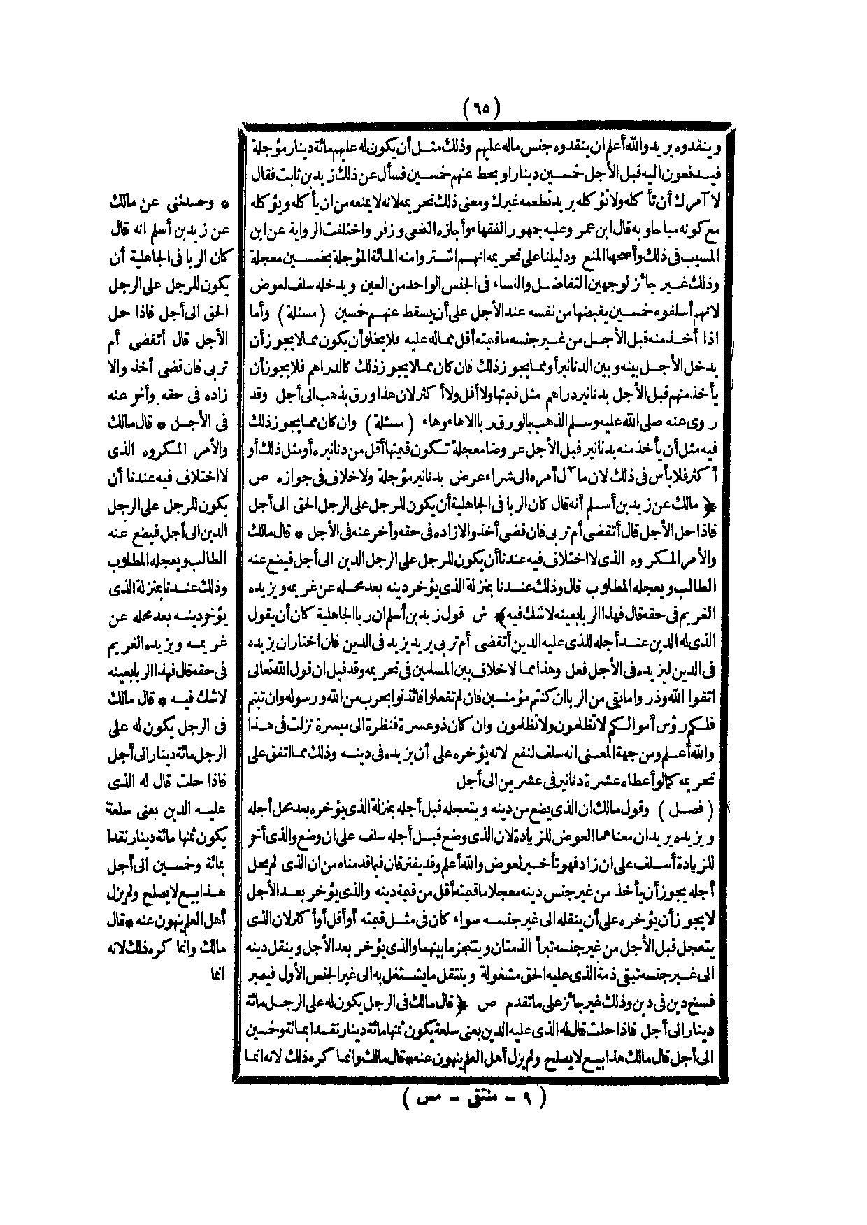 (ش) : قَوْلُ زَيْدِ بْنِ أَسْلَمَ إنَّ رِبَا الْجَاهِلِيَّةِ كَانَ أَنْ يَقُولَ الَّذِي لَهُ الدَّيْنُ عِنْدَ أَجَلِهِ لِلَّذِي عَلَيْهِ الدَّيْنُ أَتَقْضِي أَمْ تُرْبِي يُرِيدُ يَزِيدُ فِي الدَّيْنِ فَإِنْ اخْتَارَ أَنْ يَزِيدَهُ فِي الدَّيْنِ لِيَزِيدَهُ فِي الْأَجَلِ فَعَلَ، وَهَذَا مِمَّا لَا خِلَافَ بَيْنَ الْمُسْلِمِينَ فِي تَحْرِيمِهِ، وَقَدْ قِيلَ أَنَّ قَوْلَ اللَّهِ تَعَالَى {اتَّقُوا اللَّهَ وَذَرُوا مَا بَقِيَ مِنَ الرِّبَا إِنْ كُنْتُمْ مُؤْمِنِينَ} [البقرة: 278] {فَإِنْ لَمْ تَفْعَلُوا فَأْذَنُوا بِحَرْبٍ مِنَ اللَّهِ وَرَسُولِهِ وَإِنْ تُبْتُمْ فَلَكُمْ رُءُوسُ أَمْوَالِكُمْ لا تَظْلِمُونَ وَلا تُظْلَمُونَ} [البقرة: 279] {وَإِنْ كَانَ ذُو عُسْرَةٍ فَنَظِرَةٌ إِلَى مَيْسَرَةٍ} [البقرة: 280] نَزَلَتْ فِي هَذَا، وَاَللَّهُ أَعْلَمُ وَمِنْ جِهَةِ الْمَعْنَى أَنَّهُ سَلَفٌ لِنَفْعٍ؛ لِأَنَّهُ يُؤَخِّرُهُ عَلَى أَنْ يَزِيدَهُ فِي دَيْنِهِ، وَذَلِكَ مِمَّا اُتُّفِقَ عَلَى تَحْرِيمِهِ كَمَا لَوْ أَعْطَاهُ عَشَرَةَ دَنَانِيرَ فِي عِشْرِينَ إلَى أَجَلٍ.