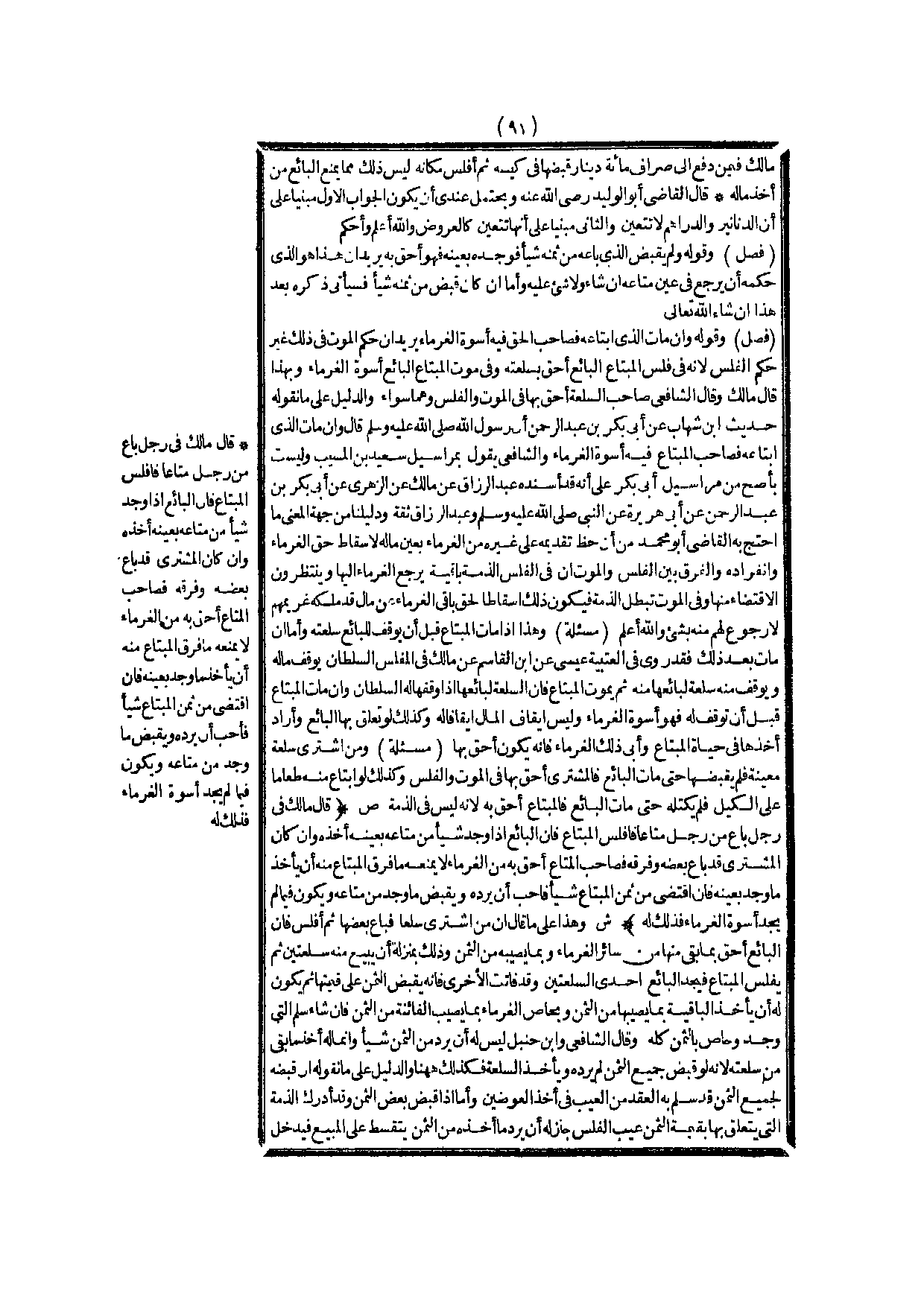 ـــــــــــــــــــــــــــــQمَالِكٍ فِيمَنْ دَفَعَ إلَى صَرَّافٍ مِائَةَ دِينَارٍ قَبَضَهَا فِي كِيسِهِ ثُمَّ أَفْلَسَ مَكَانَهُ لَيْسَ ذَلِكَ مِمَّا يَمْنَعُ الْبَائِعَ مِنْ أَخْذِ مَالِهِ قَالَ الْقَاضِي أَبُو الْوَلِيدِ - رَضِيَ اللَّهُ عَنْهُ -، وَيَحْتَمِلُ عِنْدِي أَنْ يَكُونَ الْجَوَابُ الْأَوَّلُ مَبْنِيًّا عَلَى أَنَّ الدَّنَانِيرَ وَالدَّرَاهِمَ لَا تَتَعَيَّنُ، وَالثَّانِي مَبْنِيًّا عَلَى أَنَّهَا تَتَعَيَّنُ كَالْعُرُوضِ، وَاَللَّهُ أَعْلَمُ، وَأَحْكَمُ.