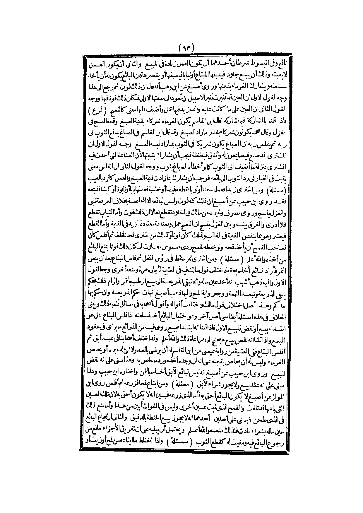 ـــــــــــــــــــــــــــــQابْنِ نَافِعٍ، وَفِي الْمَبْسُوطِ شَرْطَانِ أَحَدُهُمَا أَنْ يَكُونَ الْعَمَلُ زِيَادَةً فِي الْمَبِيعِ، وَالثَّانِي أَنْ يَكُونَ الْعَمَلُ لَا يُفِيتُهُ، وَذَلِكَ أَنْ يَبِيعَ جُلُودًا فَيَدْبُغَهَا الْمُبْتَاعُ أَوْ ثِيَابًا فَيَصْبُغَهَا أَوْ يُقَصِّرَهَا فَإِنَّ الْبَائِعَ يَكُونُ لَهُ أَنْ يَأْخُذَ سِلْعَتَهُ، وَيُشَارِكَ الْغُرَمَاءَ بِقِيمَتِهَا، وَرَوَى أَصْبَغُ عَنْ ابْنِ وَهْبٍ أَنَّهُ قَالَ إنَّ ذَلِكَ فَوْتٌ ثُمَّ رَجَعَ إلَى هَذَا وَجْهُ الْقَوْلِ الْأَوَّلِ أَنَّ الْعَيْنَ قَدْ تَغَيَّرَتْ تَغَيُّرًا لَا سَبِيلَ أَنْ تَعُودَ إلَى صِفَتِهَا الْأُولَى فَكَانَ ذَلِكَ فَوْتًا فِيهَا، وَوَجْهُ الْقَوْلِ الثَّانِي أَنَّ الْعَيْنَ عَلَى مَا كَانَتْ عَلَيْهِ، وَإِنَّمَا زِيدَ فِيهَا عَمَلٌ، وَأُضِيفَ إلَيْهَا مَعْنًى كَالنَّسْجِ.