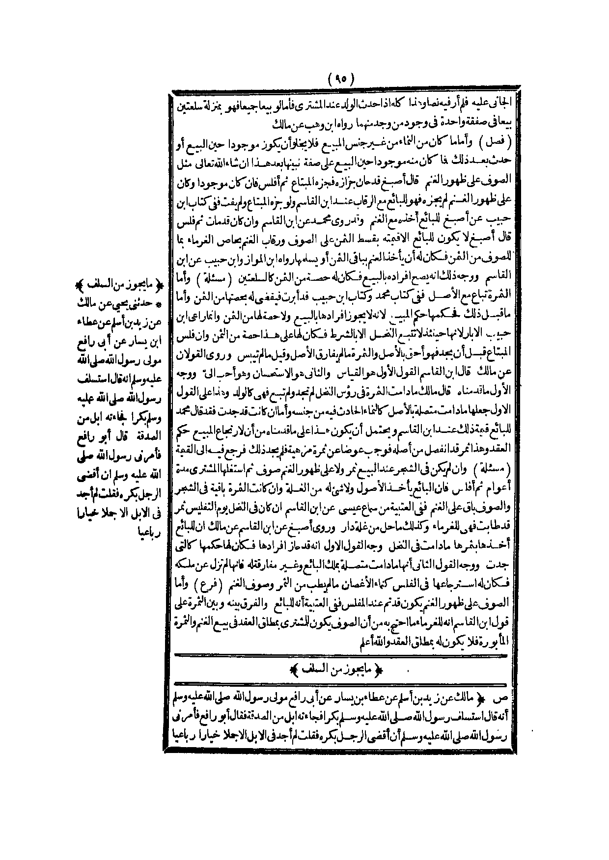 مَا يَجُوزُ مِنْ السَّلَفِ (ص) : (مَالِكٌ عَنْ زَيْدِ بْنِ أَسْلَمَ عَنْ عَطَاءِ بْنِ يَسَارٍ عَنْ أَبِي رَافِعٍ مَوْلَى رَسُولِ اللَّهِ - صَلَّى اللَّهُ عَلَيْهِ وَسَلَّمَ - أَنَّهُ قَالَ «اسْتَسْلَفَ رَسُولُ اللَّهِ - صَلَّى اللَّهُ عَلَيْهِ وَسَلَّمَ - بَكْرًا فَجَاءَتْهُ إبِلٌ مِنْ الصَّدَقَةِ فَقَالَ أَبُو رَافِعٍ فَأَمَرَنِي رَسُولُ اللَّهِ - صَلَّى اللَّهُ عَلَيْهِ وَسَلَّمَ - أَنْ أَقْضِيَ الرَّجُلَ بَكْرَهُ فَقُلْت لَمْ أَجِدْ فِي الْإِبِلِ إلَّا جَمَلًا خِيَارًا رُبَاعِيًّا