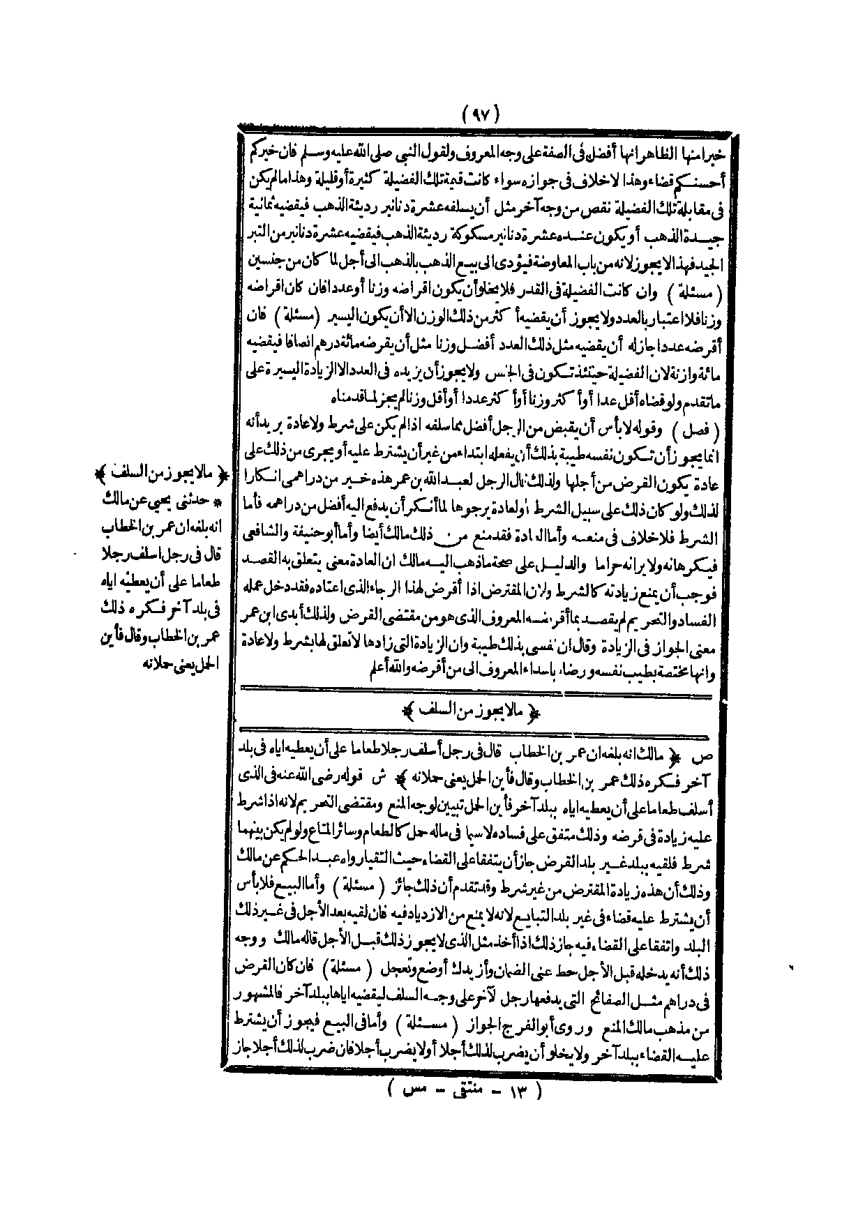مَا لَا يَجُوزُ مِنْ السَّلَفِ (ص) : (مَالِكٌ أَنَّهُ بَلَغَهُ أَنَّ عُمَرَ بْنَ الْخَطَّابِ قَالَ فِي رَجُلٍ أَسْلَفَ رَجُلًا طَعَامًا عَلَى أَنْ يُعْطِيَهُ إيَّاهُ فِي بَلَدٍ آخَرَ فَكَرِهَ ذَلِكَ عُمَرُ بْنُ الْخَطَّابِ، وَقَالَ فَأَيْنَ الْحَمْلُ يَعْنِي حُمْلَانَهُ) .