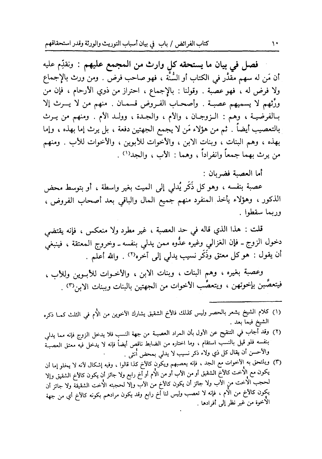 فصل في بيان ما يستحقه كل وارث من المجمع عليهم : ونقدم عليه أن من له سهم مقدر في الكتاب أو السنة، فهو صاحب فرض. ومن ورث بالاجماع ولا فرض له، فهو عصبة. وقولنا: بالاجماع، احتراز من ذوي الارحام، فإن من ورثهم لا يسميهم عصبة. وأصحاب الفروض قسمان. منهم من لا يرث إلا بالفرضية، وهم: الزوجان، والام، والجدة، وولد الام. ومنهم من يرث بالتعصيب أيضا. ثم من هؤلاء من لا يجمع الجهتين دفعة، بل يرث إما بهذه، وإما بهذه، وهم البنات، وبنات الابن، والاخوات للابوين، والاخوات للاب. ومنهم من يرث بهما جمعا وانفرادا، وهما: الاب، والجد. أما العصبة، فضربان: عصبة بنفسه، وهو كل ذكر يدلي إلى الميت بغير واسطة، أو بتوسط محض الذكور، وهؤلاء يأخذ المنفرد منهم جميع المال والباقي بعد أصحاب الفروض، وربما سقطوا. قلت: هذا الذي قاله في حد العصبة، غير مطرد ولا منعكس، فإنه يقتضي دخول الزوج - فإن الغزالي وغيره عدوه ممن يدلي بنفسه - وخروج المعتقة، فينبغي أن يقول: هو كل معتق وذكر نسيب يدلي إلى آخره. والله أعلم. وعصبة بغيره، وهم البنات، وبنات الابن والاخوات للابوين وللاب، فيتعصبن باخوتهن، ويتعصب الاخوات من الجهتين بالبنات وببنات الابن.