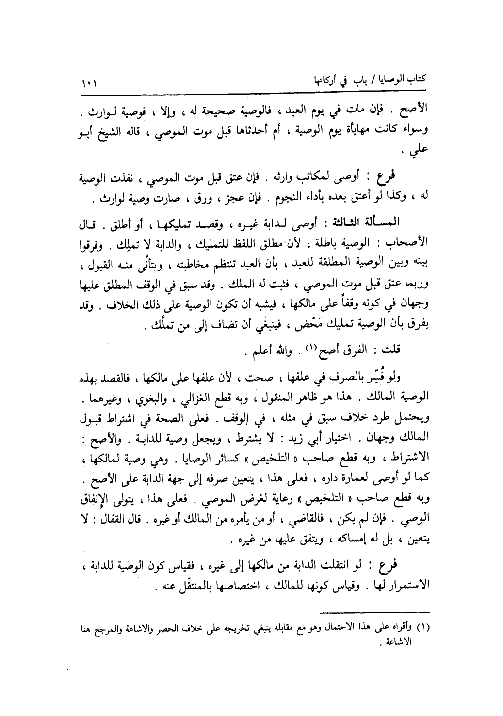 الاصح. فإن مات في يوم العبد، فالوصية صحيحة له، وإلا، فوصية لوارث. وسواء كانت مهايأة يوم الوصية، أم أحدثاها قبل موت الموصي، قاله الشيخ أبو علي. فرع أوصى لمكاتب وارثه. فإن عتق قبل موت الموصي، نفذت الوصية له، وكذا لو أعتق بعده بأداء النجوم. فاعجز، ورق، صارت وصية لوارث. المسألة الثالثة: أوصى لدابة غيره، وقصد تمليكها، أو أطلق. قال الاصحاب: الوصية باطلة، لان مطلق اللفظ للتمليك، والدابة لا تملك. وفرقوا بينه وبين الوصية المطلقة للعبد، بأن العبد تنتظم مخاطبته، ويتأتى منه القبول، وربما عتق قبل موت الموصي، فثبت له الملك. وقد سبق في الوقف المطلق عليها وجهان في كونه وقفا على مالكها، فيشبه أن تكون الوصية على ذلك الخلاف. وقد يفرق بأن الوصية تمليك محض، فينبغي أن تضاف إلى من تملك. قلت: الفرق أصح. والله أعلم. ولو فسر بالصرف في علفها، صحت، لان علفها على مالكها، فالقصد بهذه الوصية المالك. هذا هو ظاهر المنقول، وبه قطع الغزالي، والبغوي، وغيرهما. ويحتمل طرد خلاف سبق في مثله، في الوقف. فعلى الصحة في اشتراط قبول المالك وجهان. اختيار أبي زيد: لا يشترط ويجعل وصية للدابة. والاصح: الاشتراط، وبه قطع صاحب التلخيص كسائر الوصايا. وهي وصية لمالكها، كما لو أوصى لعمارة داره، فعلى هذا، يتعين صرفه إلى جهة الدابة على الاصح. وبه قطع صاحب التلخيص رعاية لغرض الموصي. فعلى هذا، يتولى الانفاق الوصي. فإن لم يكن، فالقاضي، أو من يأمره من المالك أو غيره. قال القفال: لا يتعين، بل له إمساكه، وينفق عليها من غيره. فرع لو انتقلت الدابة من مالكها إلى غيره، فقياس كون الوصية للدابة، الاستمرار لها. وقياس كونها للمالك، اختصاصها بالمنتقل عنه.