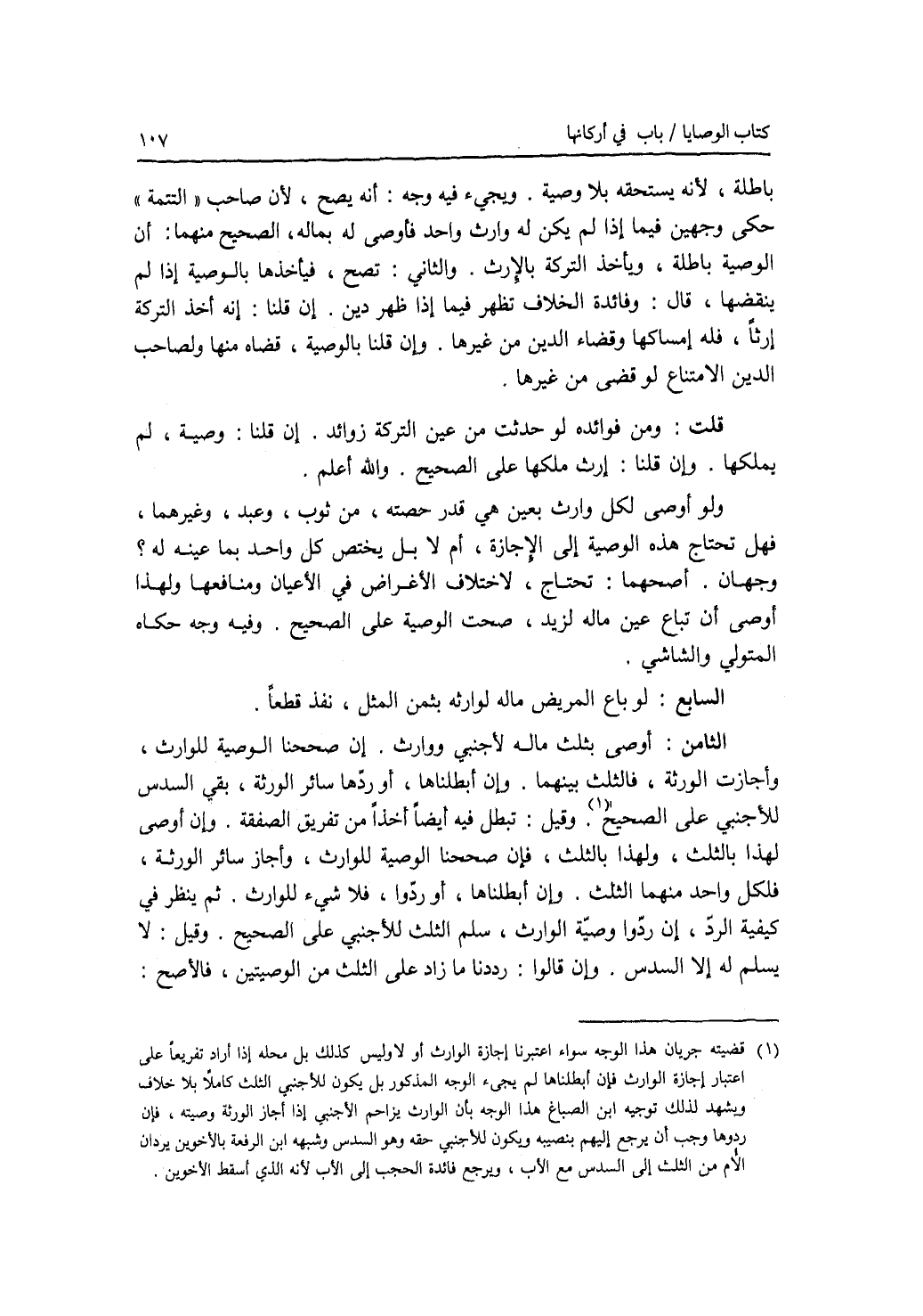 باطلة، لانه يستحقه بلا وصية. ويجئ فيه أوجه: أنه يصح، لان صاحب التتمة حكى وجهين فيما إذا لم يكن له إلا وارث واحد فأوصى له بماله، الصحيح منهما: أن الوصية باطلة، ويأخذ التركة بالارث. والثاني: تصح، فيأخذها بالوصية إذا لم ينقضها، قال: وفائدة الخلاف تظهر فيما إذا ظهر دين. إن قلنا: إنه أخذ التركة إرثا، فله إمساكها وقضاء الدين من غيرها. وإن قلنا بالوصية، قضاه منها ولصاحب الدين الامتناع لو قضى من غيرها. قلت: ومن فوائده لو حدثت من عين التركة زوائده. إن قلنا: وصية، لم يملكها. وإن قلنا: إرث ملكها على الصحيح. والله أعلم. ولو أوصى لكل وارث بعين هي قدر حصته، من ثوب، وعبد، وغيرهما، فهل تحتاج هذه الوصية إلى الاجازة، أم لا بل يختص كل واحد بما عينه له ؟ وجهان. أصحهما: تحتاج، لاختلاف الاغراض في الاعيان ومنافعها. ولهذا أوصى أن تباع عين ماله لزيد، صحت الوصية على الصحيح. وفيه وجه حكاه المتولي والشاشي. السابع: لو باع المريض ماله لوارثه بثمن المثل، نفذ قطعا. الثامن: أوصى بثلث ماله لاجنبي ووارث. إن صححنا الوصية للوارث، وأجازت الورثة، فالثلث بينهما. وإن أبطلناها، أو ردها سائر الورثة، بقي السدس للاجنبي على الصحيح. وقيل: تبطل فيه أيضا أخذا من تفريق الصفقة. وإن أوصى لهذا بالثلث، ولهذا بالثلث، فإن صححنا الوصية للوارث، وأجاز سائر الورثة، فلكل واحد منهما الثلث. وإن أبطلناها، أو ردوا، فلا شئ للوارث. ثم ينظر في كيفية الرد، إن ردوا وصية الوارث، سلم الثلث للاجنبي على الصحيح. وقيل: لا يسلم له إلا السدس. وإن قالوا: رددنا ما زاد على الثلث من الوصيتين، فالاصح: