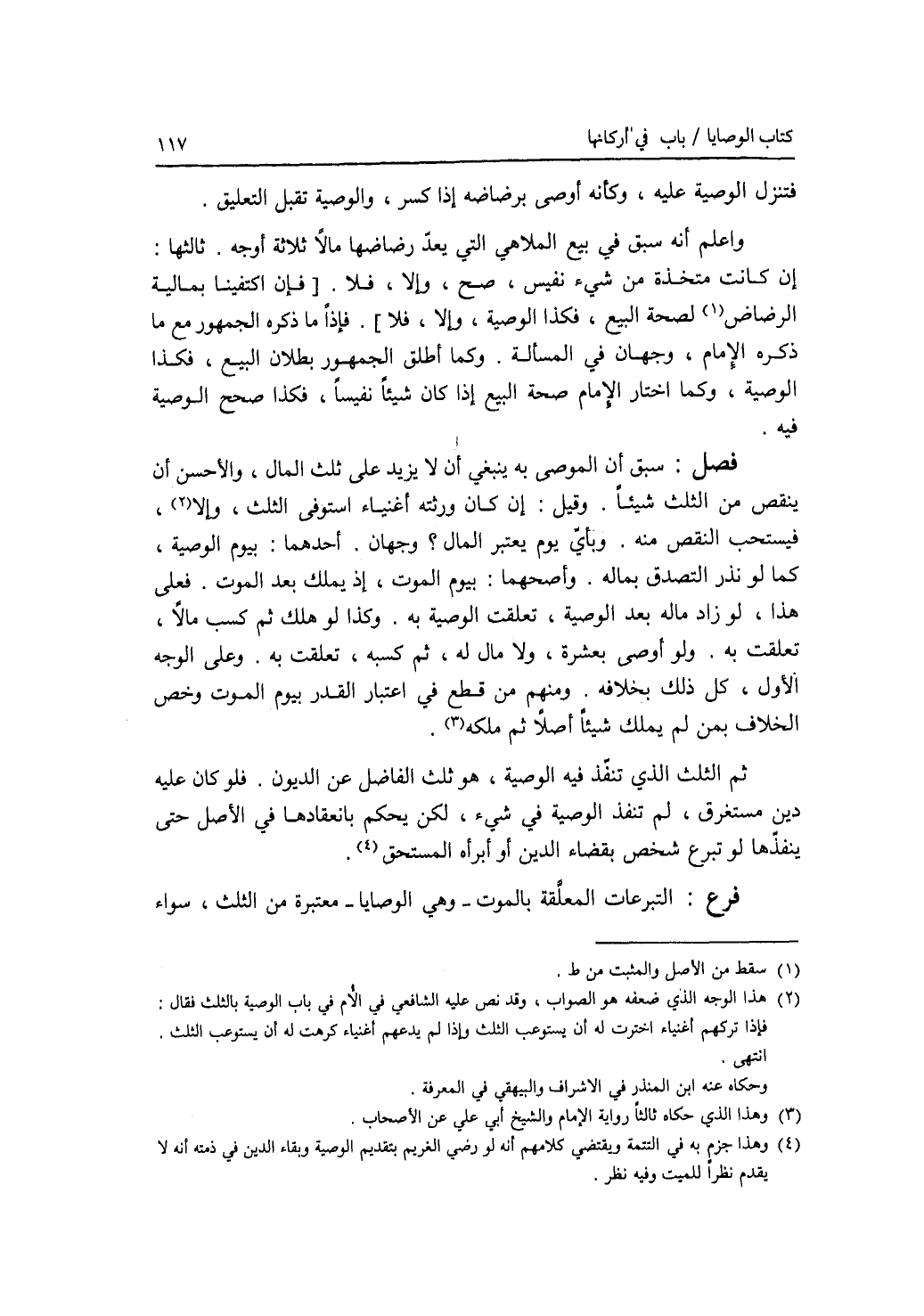 فتنزل الوصية عليه، وكأنه أوصى برضاضه إذا كسر، والوصية تقبل التعليق. واعلم أنه سبق في بيع الملاهي التي يعد رضاضها مالا ثلاثة أوجه. ثالثها: إن كانت متخذة من شئ نفيس، صح، وإلا، فلا. فإن اكتفينا بمالية الرضاض لصحة البيع، فكذا الوصية، وإلا، فلا. فإذا ما ذكره الجمهور مع ما ذكره الامام، وجهان في المسألة. وكما أطلق الجمهور بطلان البيع، فكذا الوصية، وكما اختار الامام صحة البيع إذا كان شيئا نفيسا، فكذا صحح الوصية فيه. فصل سبق أن الموصى به ينبغي أن لا يزيد على ثلث المال، والاحسن أن ينقص من الثلث شيئا. وقيل: إن كان ورثته أغنياء استوفى الثلث، وإلا، فيستحب النقص منه. وبأي يوم يعتبر المال ؟ وجهان. أحدهما: بيوم الوصية، كما لو نذر التصدق بماله. وأصحهما: بيوم الموت، إذ يملك بعد الموت. فعلى هذا، لو زاد ماله بعد الوصية، تعلقت الوصية به. وكذا لو هلك ثم كسب مالا، تعلقت به. ولو أوصى بعشرة ولا مال له، ثم كسبه، تعلقت به. وعلى الوجه الاول، كل ذلك بخلافه. ومنهم من قطع في اعتبار القدر بيوم الموت وخص الخلاف بمن لم يملك شيئا أصلا ثم ملكه. ثم الثلث الذي تنفذ فيه الوصية، هو ثلث الفاضل عن الديون. فلو كان عليه دين مستغرق، لم تنفذ الوصية في شئ، لكن يحكم بانعقادها في الاصل حتى ينفذها لو تبرع شخص بقضاء الدين أو أبرأه المستحق. فرع التبرعات المعلقة بالموت - وهي الوصايا - معتبرة من الثلث، سواء
