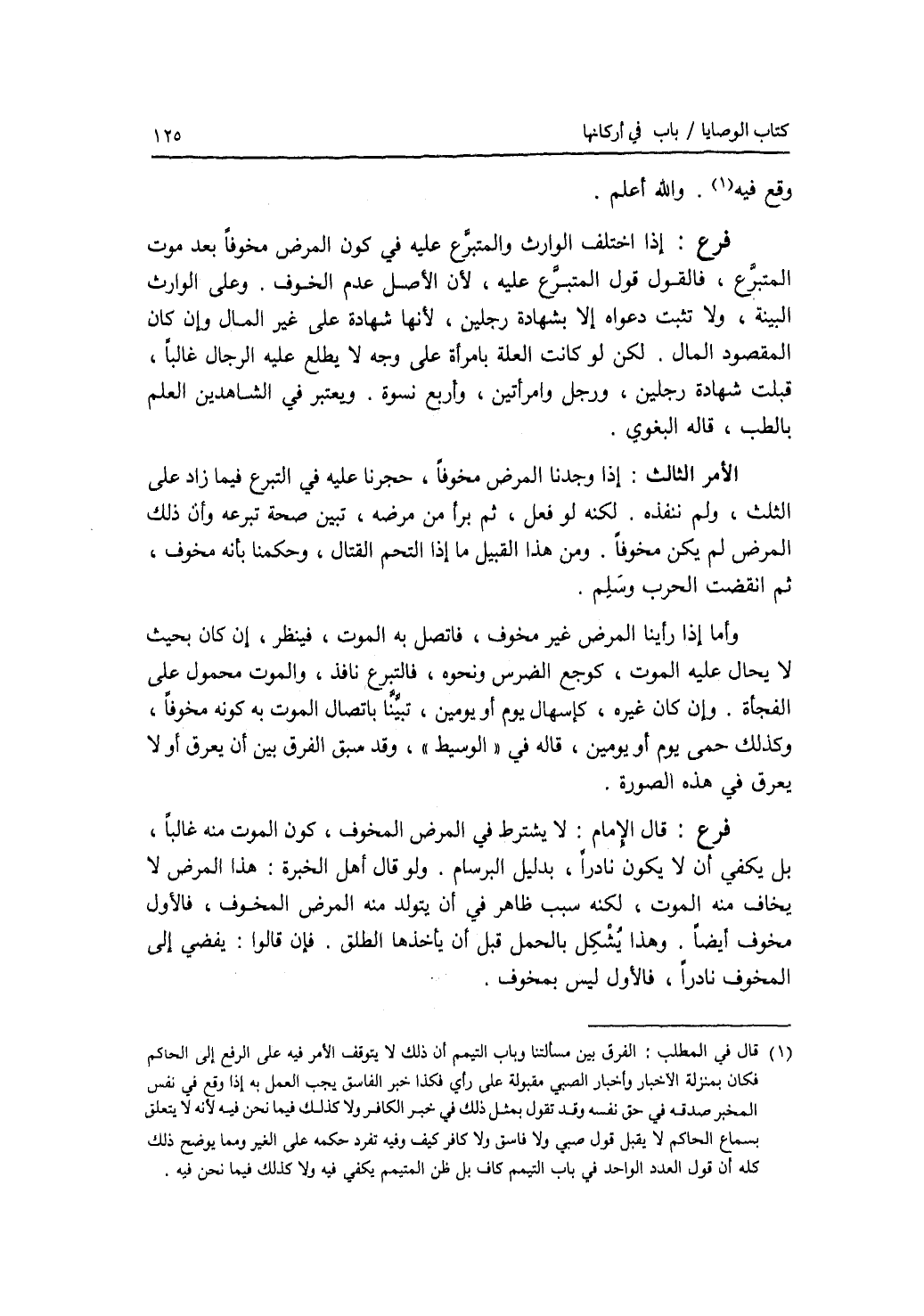 وقع فيه. والله أعلم. فرع إذا اختلف الوارث والمتبرع عليه في كون المرض مخوفا بعد موت المتبرع، فالقول قول المتبرع عليه، لان الاصل عدم الخوف. وعلى الوارث البينة، ولا تثبت دعواه إلا بشهادة رجلين، لانها شهادة على غير المال وإن كان المقصود المال. لكن لو كانت العلة بامرأة على وجه لا يطلع عليه الرجال غالبا، قبلت شهادة رجلين، ورجل وامرأتين، وأربع نسوة. ويعتبر في الشاهدين العلم بالطب، قاله البغوي. الامر الثالث: إذا وجدنا المرض مخوفا، حجرنا عليه في التبرع فيما زاد على الثلث، ولم ننفذه. لكنه لو فعل، ثم برأ من مرضه، تبين صحة تبرعه وأن ذلك المرض لم يكن مخوفا. ومن هذا القبيل ما إذا التحم القتال، وحكمنا بأنه مخوف، ثم انقضت الحرب وسلم. وأما إذا رأينا المرض غير مخوف، فاتصل به الموت، فينظر، إن كان بحيث لا يحال عليه الموت، كوجع الضرس ونحوه، فالتبرع نافذ، والموت محمول على الفجأة. وإن كان غيره، كإسهال يوم أو يومين، تبينا باتصال الموت به كونه مخوفا، وكذلك حمى يوم أو يومين، قاله في الوسيط، وقد سبق الفرق بين أن يعرق أو لا يعرق في هذه الصورة. فرع قال الامام: لا يشترط في المرض المخوف، كون الموت منه غالبا، بل يكفي أن لا يكون نادرا، بدليل البرسام. ولو قال أهل الخبرة: هذا المرض لا يخاف منه الموت، لكنه سبب ظاهر في أن يتولد منه المرض المخوف، فالاول مخوف أيضا. وهذا يشكل بالحمل قبل أن يأخذها الطلق. فإن قالوا: يفضي إلى المخوف نادرا، فالاول ليس بمخوف.