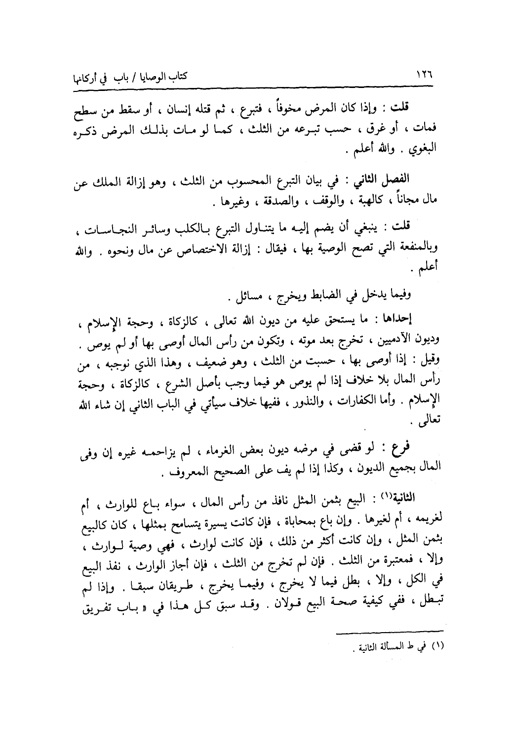 قلت: وإذا كان المرض مخوفا، فتبرع، ثم قتله إنسان، أو سقط من سطح فمات، أو غرق، حسب تبرعه من الثلث، كما لو مات بذلك المرض ذكره البغوي. والله أعلم. الفصل الثاني: في بيان التبرع المحسوب من الثلث، وهو إزالة الملك عن مال مجانا، كالهبة، والوقف، والصدقة، وغيرها. قلت: ينبغي أن يضم إليه ما يتناول التبرع بالكلب وسائر النجاسات، وبالمنفعة التي تصح الوصية بها، فيقال: إزالة الاختصاص عن مال ونحوه. والله أعلم. وفيما يدخل في الضابط ويخرج، مسائل. إحداها: ما يستحق عليه من ديون الله تعالى، كالزكاة، وحجة الاسلام، وديون الآدميين، تخرج بعد موته، وتكون من رأس المال أوصى بها أو لم يوص. وقيل: إذا أوصى بها، حسبت من الثلث، وهو ضعيف، وهذا الذي نوجبه، من رأس المال بلا خلاف إذا لم يوص هو فيما وجب بأصل الشرع، كالزكاة، وحجة الاسلام. وأما الكفارات، والنذور، ففيها خلاف سيأتي في الباب الثاني إن شاء الله تعالى. فرع لو قضى في مرضه ديون بعض الغرماء، لم يزاحمه غيره إن وفى المال بجميع الديون، وكذا إذا لم يف على الصحيح المعروف. (المسألة) الثالثة: البيع بثمن المثل نافذ من رأس المال، سواء باع للوارث، أم لغريمه، أم لغيرهما. وإن باع بمحاباة، فإن كانت يسيرة يتسامح بمثلها، كان كالبيع بثمن المثل، وإن كانت أكثر من ذلك، فإن كانت لوارث، فهي وصية لوارث، وإلا، فمعتبرة من الثلث. فإن لم تخرج من الثلث، فإن أجاز الوارث، نفذ البيع في الكل، وإلا، بطل فيما لا يخرج، وفيما يخرج، طريقان سبقا. وإذا لم تبطل، ففي كيفية صحة البيع قولان. وقد سبق كل هذا في باب تفريق