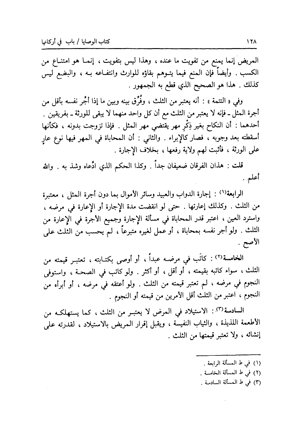 المريض إنما يمنع من تفويت ما عنده، وهذا ليس بتفويت، إنما هو امتناع من الكسب. وأيضا فإن المنع فيما يتوهم بقاؤه للوارث وانتفاعه به، والبضع ليس كذلك. هذا هو الصحيح الذي قطع به الجمهور. وفي التتمة: أنه يعتبر من الثلث، وفرق بينه وبين ما إذا أجر نفسه بأقل من أجرة المثل - فإنه لا يعتبر من الثلث مع أن كل واحد منهما لا يبقى للورثة - بفرقين. أحدهما: أن النكاح بغير ذكر مهر يقتضي مهر المثل، فإذا تزوجت بدونه، فكأنها أسقطته بعد وجوبه، فصار كالابراء. والثاني: أن المحاباة في المهر فيها نوع عار على الورثة، فأثبت لهم ولاية رفعها، بخلاف الاجارة. قلت: هذان الفرقان ضعيفان جدا. وكذا الحكم الذي ادعاه وشذ به. والله أعلم. (المسألة) الرابعة: إجارة الدواب والعبيد وسائر الاموال بما دون أجرة المثل، معتبرة من الثلث. وكذلك إعارتها. حتى لو انقضت مدة الاجارة أو الاعارة في مرضه، واسترد العين، اعتبر قدر المحاباة في مسألة الاجارة وجميع الاجرة في الاعارة من الثلث. ولو أجر نفسه بمحاباة، أو عمل لغيره متبرعا، لم يحسب من الثلث على الاصح. (المسألة) الخامسة: كاتب في مرضه عبدا، أو أوصى بكتابته، تعتبر قيمته من الثلث، سواء كاتبه بقيمته، أو أقل، أو أكثر. ولو كاتب في الصحة، واستوفى النجوم في مرضه، لم تعتبر قيمته من الثلث. ولو أعتقه في مرضه، أو أبرأه من النجوم، اعتبر من الثلث أقل الامرين من قيمته أو النجوم. (المسألة) السادسة: الاستيلاد في المرض لا يعتبر من الثلث، كما يستهلكه من الاطعمة اللذيذة، والثياب النفيسة، ويقبل إقرار المريض بالاستيلاد، لقدرته على إنشائه، ولا تعتبر قيمتها من الثلث. المسألة