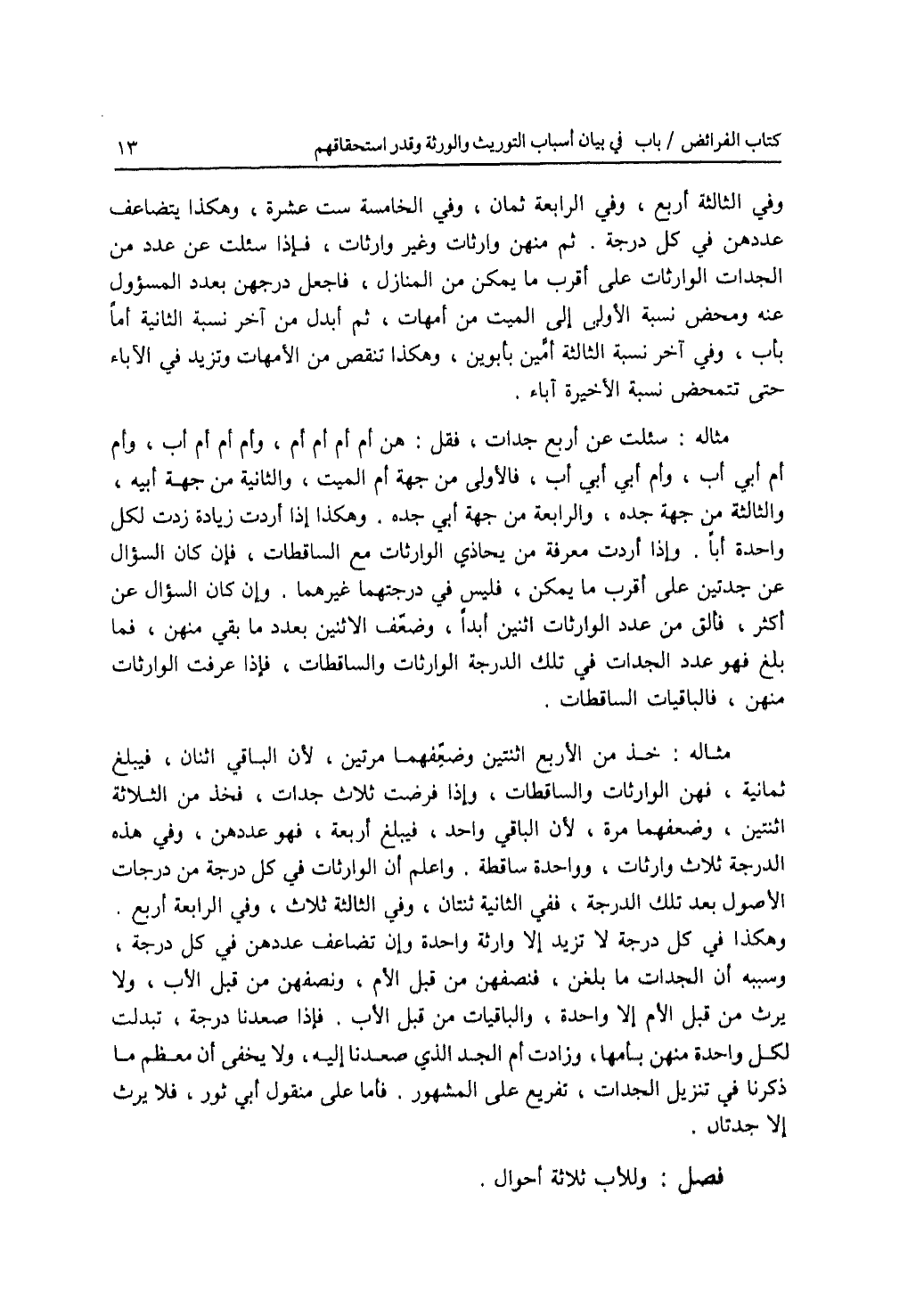 وفي الثالثة أربع، وفي الرابعة ثمان، وفي الخامسة ست عشرة، وهكذا يتضاعف عددهن في كل درجة. ثم منهن وارثات وغير وارثات، فإذا سئلت عن عدد من الجدات الوارثات على أقرب ما يمكن من المنازل، فاجعل درجهن بعدد المسؤول عنه ومحض نسبة الاولى إلى الميت من أمهات، ثم أبدل من اخر نسبة الثانية أما بأب، وفي اخر نسبة الثالثة أمين بأبوين، وهكذا تنقص من الامهات وتزيد في الآباء حتى تتمحض نسبة الاخيرة آباء مثاله: سئلت عن أربع جدات، فقل: هن أم أم أم أم، وأم أم أم أب، وأم أم أبي أب، وأم أبي أبي أب، فالاولى من جهة أم الميت، والثانية من جهة أبيه، والثالثة من جهة جده، والرابعة من جهة أبي جده. وهكذا إذا أردت زيادة زدت لكل واحدة أبا. وإذا أردت معرفة من يحاذي الوارثات مع الساقطات، فإن كان السؤال عن جدتين على أقرب ما يمكن، فليس في درجتهما غيرهما. وإن كان السؤال عن أكثر، فألق من عدد الوارثات اثنين أبدا، وضعف الاثنين بعدد ما بقي منهن، فما بلغ فهو عدد الجدات في تلك الدرجة الوارثات والساقطات. فإذا عرفت الوارثات منهن، فالباقيات الساقطات. مثاله: خذ من الاربع اثنتين وضعفهما مرتين، لان الباقي اثنان، فيبلغ ثمانية، فهن الوارثات والساقطات، وإذا فرضت ثلاث جدات، فخذ من الثلاثة اثنتين، وضعفهما مرة، لان الباقي واحد، فيبلغ أربعة، فهو عددهن، في هذه الدرجة ثلاث وارثات، وواحدة ساقطة. واعلم أن الوارثات في كل درجة من درجات الاصول بعد تلك الدرجة، ففي الثانية ثنتان، وفي الثالثة ثلاث، وفي الرابعة أربع. وهكذا في كل درجة لا تزيد إلا وارثة واحدة وإن تضاعف عددهن في كل درجة، وسببه أن الجدات ما بلغن، فنصفهن من قبل الام، ونصفهن من قبل الاب، ولا يرث من قبل الام إلا واحدة، والباقيات من قبل الاب. فإذا صعدنا درجة، تبدلت لكل واحدة منهن بأمها، وزادت أم الجد الذي صعدنا إليه، ولا يفى أن معظم ما ذكرنا في تنزيل الجدات، تفريع على المشهور. فأما على منقول أبي ثور، فلا يرث إلا جدتان.