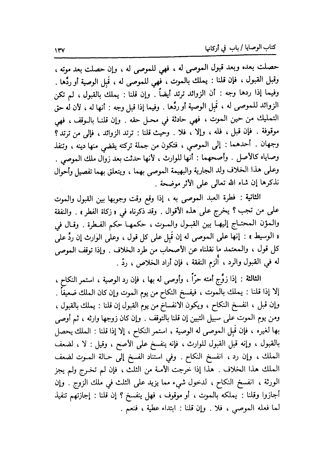 حصلت بعده وبعد قبول الموصى له، فهي للموصى له، وإن حصلت بعد موته، وقبل القبول، فإن قلنا: يملك بالموت، فهي للموصى له، قبل الوصية أو ردها. وفيما إذا ردها وجه: أن الزوائد ترتد أيضا. وإن قلنا: يملك بالقبول، لم تكن الزوائد للموصى له، قبل الوصية أو ردها. وفيما إذا قبل وجه: أنها له، لان له حق التمليك من حين الموت، فهي حادثة في محل حقه. وإن قلنا بالوقف، فهي موقوفة. فإن قبل، فله، وإلا، فلا. وحيث قلنا: ترتد الزوائد، فإلى من ترتد ؟ وجهان. أحدهما: إلى الموصي، فتكون من جملة تركته يقضى منها دينه، وتنفذ وصاياه كالاصل. وأصحهما: أنها للوارث، لانها حدثت بعد زوال ملك الموصي. وعلى هذا الخلاف ولد الجارية والبهيمة الموصى بهما، ويتعلق بهما تفصيل وأحوال نذكرها إن شاء الله تعالى على الاثر موضحة. الثانية: فطرة العبد الموصى به، إذا وقع وقت وجوبها بين القبول والموت على من تجب ؟ يخرج على هذه الاقوال. وقد ذكرناه في زكاة الفطر. والنفقة والمؤن المحتاج إليها بين القبول والموت، حكمها حكم الفطرة. وقال في الوسيط: إنها على الموصى له إن قبل على كل قول، وعلى الوارث إن رد على كل قول، والمعتمد ما نقلناه عن الاصحاب من طرد الخلاف. وإذا توقف الموصى له في القبول والرد، ألزم النفقة، فإن أراد الخلاص، رد. الثالثة: إذا زوج أمته حرا، وأوصى له بها، فإن رد الوصية، استمر النكاح، إلا إذا قلنا: يملك بالموت، فيفسخ النكاح من يوم الموت وإن كان الملك ضعيفا. وإن قبل، انفسخ النكاح، ويكون الانفساخ من يوم القبول إن قلنا: يملك بالقبول، ومن يوم الموت على سبيل التبين إن قلنا بالتوقف. وإن كان زوجها وارثه، ثم أوصى بها لغيره، فإن قبل الموصى له الوصية، استمر النكاح، إلا إذا قلنا: الملك يحصل بالقبول، وإنه قبل القبول للوارث، فإنه ينفسخ على الاصح. وقيل: لا، لضعف الملك، وإن رد، انفسخ النكاح. وفي استناد الفسخ إلى حالة الموت لضعف الملك هذا الخلاف. هذا إذا خرجت الامة من الثلث، فإن لم تخرج ولم يجز الورثة، انفسخ النكاح، لدخول شئ مما يزيد على الثلث في ملك الزوج. وإن أجازوا وقلنا: يملكه بالموت، أو موقوف، فهل ينفسخ ؟ إن قلنا: إجازتهم تنفيذ لما فعله الموصي، فلا. وإن قلنا: ابتداء عطية، فنعم.