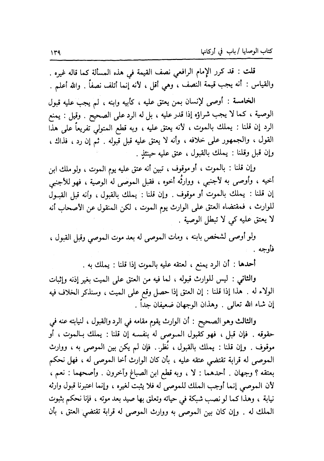 قلت: قد كرر الامام الرافعي نصف القيمة في هذه المسألة كما قاله غيره. والقياس: أنه يجب قيمة النصف، وهي أقل، لانه إنما أتلف نصفا. والله أعلم. الخامسة: أوصى لانسان بمن يعتق عليه، كأبيه وابنه، لم يجب عليه قبول الوصية، كما لا يجب شراؤه إذا قدر عليه، بل له الرد على الصحيح. وقيل: يمنع الرد إن قلنا: يملك بالموت، لانه يعتق عليه، وبه قطع المتولي تفريعا على هذا القول والجمهور على خلافه، وأنه لا يعتق عليه قبل قبوله. ثم إن رد، فذاك، وإن قبل و قلنا: يملك بالقبول، عتق عليه حينئذ. وإن قلنا: بالموت، أو موقوف، تبين أنه عتق عليه يوم الموت. ولو ملك ابن أخيه، وأوصى به لاجنبي، ووارثه أخوه، فقبل الموصى له الوصية، فهو للاجنبي إن قلنا: يملك بالموت أو موقوف. وإن قلنا: يملك بالقبول، وأنه قبل القبول للوارث، فمقتضاه العتق على الوارث يوم الموت، لكن المنقول عن الاصحاب أنه لا يعتق عليه كي لا تبطل الوصية. ولو أوصى لشخص بإبنه، ومات الموصى له بعد موت الموصي وقبل القبول، فأوجه. أحدها: أن الرد يمنع، لعتقه عليه بالموت إذا قلنا: يملك به. والثاني: ليس للوارث قبوله، لما فيه من العتق على الميت بغير إذنه وإثبات الولاء له. هذا إذا قلنا: إن العتق إذا حصل وقع على الميت، وسنذكر الخلاف فيه إن شاء الله تعالى. وهذان الوجهان ضعيفان جدا. والثالث وهو الصحيح: أن الوارث يقوم مقامه في الرد والقبول، لنيابته عنه في حقوقه. فإن قبل، فهو كقبول الموصى له بنفسه إن قلنا: يملك بالموت، أو موقوف. وإن قلنا: يملك بالقبول، نظر. فإن لم يكن بين الموصى به، ووارث الموصى له قرابة تقتضي عتقه عليه، بأن كان الوارث أخا الموصى له، فهل نحكم بعتقه ؟ وجهان. أحدهما: لا، وبه قطع ابن الصباغ وآخرون. وأصحهما: نعم، لان الموصي إنما أوجب الملك للموصى له فلا يثبت لغيره، وإنما اعتبرنا قبول وارثه نيابة، وهذا كما لو نصب شبكة في حياته وتعلق بها صيد بعد موته، فإنا نحكم بثبوت الملك له. وإن كان بين الموصى به ووارث الموصى له قرابة تقتضي العتق، بأن
