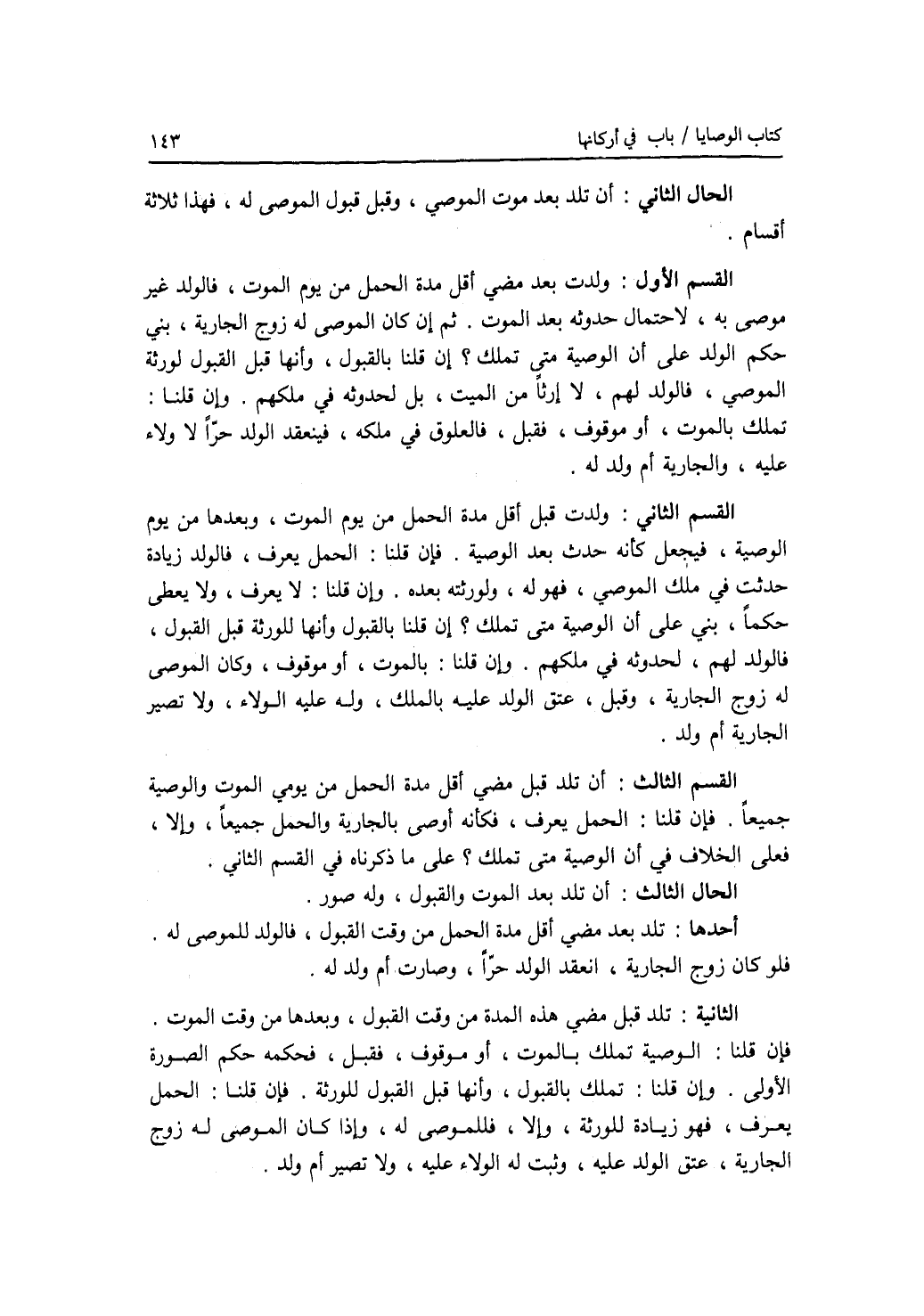 لانها علقت منه برقيق الحال الثاني: أن تلد بعد موت الموصي، وقبل قبول الموصى له، فهذا ثلاثة أقسام. (القسم) الاول: ولدت بعد مضي أقل مدة الحمل من يوم الموت، فالولد غير موصى به، لاحتمال حدوثه بعد الموت. ثم إن كان الموصى له زوج الجارية، بني حكم الولد على أن الوصية متى تملك ؟ إن قلنا بالقبول، وأنها قبل القبول لورثة الموصي، فالولد لهم، لا إرثا من الميت، بل لحدوثه في ملكهم. وإن قلنا: تملك بالموت، أو موقوف، فقبل، فالعلوق في ملكه، فينعقد الولد حرا لا ولاء عليه، والجارية أم ولد له. (القسم) الثاني: ولدت قبل أقل مدة الحمل من يوم الموت، وبعدها من يوم الوصية، فيجعل كأنه حدث بعد الوصية. فإن قلنا: الحمل يعرف، فالولد زيادة حدثت في ملك الموصي، فهو له، ولورثته بعده. وإن قلنا: لا يعرف، ولا يعطى حكما، بني على أن الوصية متى تملك ؟ إن قلنا بالقبول وأنها للورثة قبل القبول، فالولد لهم، لحدوثه في ملكهم. وإن قلنا: بالموت، أو موقوف، وكان الموصى له زوج الجارية، وقبل، عتق الولد عليه بالملك، وله عليه الولاء، ولا تصير الجارية أم ولد. (القسم) الثالث: أن تلد قبل مضي أقمدة الحمل من يومي الموت والوصية جميعا. فإن قلنا: الحمل يعرف، فكأنه أوصى بالجارية والحمل جميعا، وإلا، فعلى الخلاف في أن الوصية متى تملك ؟ على ما ذكرناه في القسم الثاني. الحال الثالث: أن تلد بعد الموت والقبول، وله صور. أحدها: تلد بعد مضي أقل مدة الحمل من وقت القبول، فالولد للموصى له. فلو كان زوج الجارية، انعقد الولد حرا، وصارت أم ولد له. الثانية: تلد قبل مضهذه المدة من وقت القبول، وبعدها من وقت الموت. فإن قلنا: الوصية تملك بالموت، أو موقوف، فقبل، فحكمه حكم الصورة الاولى. وإن قلنا: تملك بالقبول، وأنها قبل القبول للورثة. فإن قلنا: الحمل يعرف، فهو زيادة للورثة، وإلا، فللموصى له، وإذا كان الموصى له زوج الجارية، عتق الولد عليه، وثبت له الولاء عليه، ولا تصير أم ولد.
