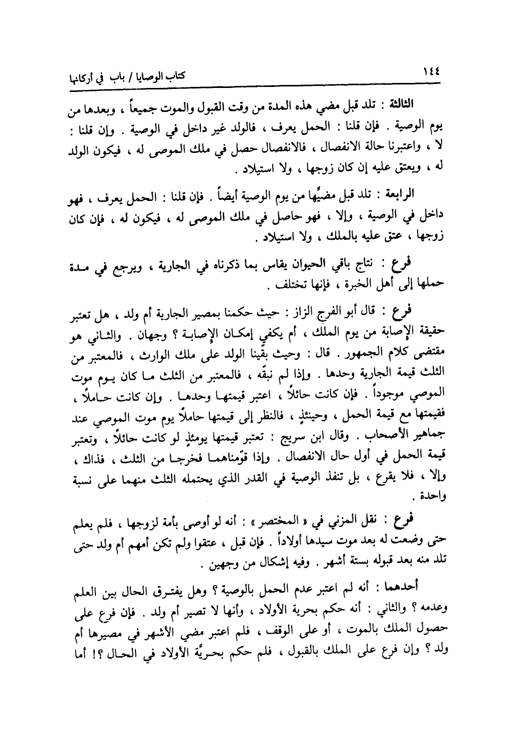 الثالثة: تلد قبل مضي هذه المدة من وقت القبول والموت جميعا، وبعدها من يوم الوصية. فإن قلنا: الحمل يعرف، فالول غير داخل في الوصية. وإن قلنا: لا، واعتبرنا حالة الانفصال، فالانفصال حصل في ملك الموصى له، فيكون الولد له، ويعتق عليه إن كان زوجها، ولا استيلاد. الرابعة: تلد قبل مضيها من يوم الوصية أيضا. فإن قلنا: الحمل يعرف، فهو داخل في الوصية، وإلا، فهو حاصل في ملك الموصى له، فيكون له، فإن كان زوجها، عتق عليه بالملك، ولا استيلاد. فرع نتاج باقي الحيوان يقاس بما ذكرناه في الجارية، ويرجع في مدة حملها إلى أهل الخبرة، فإنها تختلف. فرع قال أبو الفرج الزاز: حيث حكمنا بمصير الجارية أم ولد، هل تعتبر حقيقة الاصابة من يوم الملك، أم يكفي إمكان الا صابة ؟ وجهان. والثاني هو مقتضى كلام الجمهور. قال: وحيث بقينا الولد على ملك الوارث، فالمعتبر من الثلث قيمة الجارية وحدها. وإذا لم نبقه، فالمعتبر من الثلث ما كان يوم موت الموصي موجودا. فإن كانت حائلا، اعتبر قيمتها وحدها. وإن كانت حاملا، فقيمتها مع قيمة الحمل، وحينئذ، فالنظر إلى قيمتها حاملا يوم موت الموصي عند جماهير الاصحاب. وقال ابن سريج: تعتبر قيمتها يومئذ لو كانت حائلا، وتعتبر قيمة الحمل في أول حال الانفصال. وإذا قومناهما فخرجا من الثلث، فذاك، وإلا، فلا يقرع، بل تنفذ الوصية في القدر الذي يحتمله الثلث منهما على نسبة واحدة. فرع نقل المزني في المختصر: أنه لو أوصى بأمة لزوجها، فلم يعلم حتى وضعت له بعد موت سيدها أولادا. فإن قبل، عتقوا ولم تكن أمهم أم ولد حتى تلد منه بعد قبوله بستة أشهر. وفيه إشكال من وجهين. أحدهما: أنه لم اعتبر عدم الحمل بالوصية ؟ وهل يفترق الحال بين العلم وعدمه ؟ والثاني: أنه حكم بحرية الاولاد، وأنها لا تصير أم ولد. فإن فرع على حصول الملك بالموت، أو على الوقف، فلم اعتبر مضي الاشهر في مصيرها أم ولد ؟ وإن ؟ وإن فرع على الملك بالقبول، فلم حكم بحرية الاولاد في الحال ؟ ! أما
