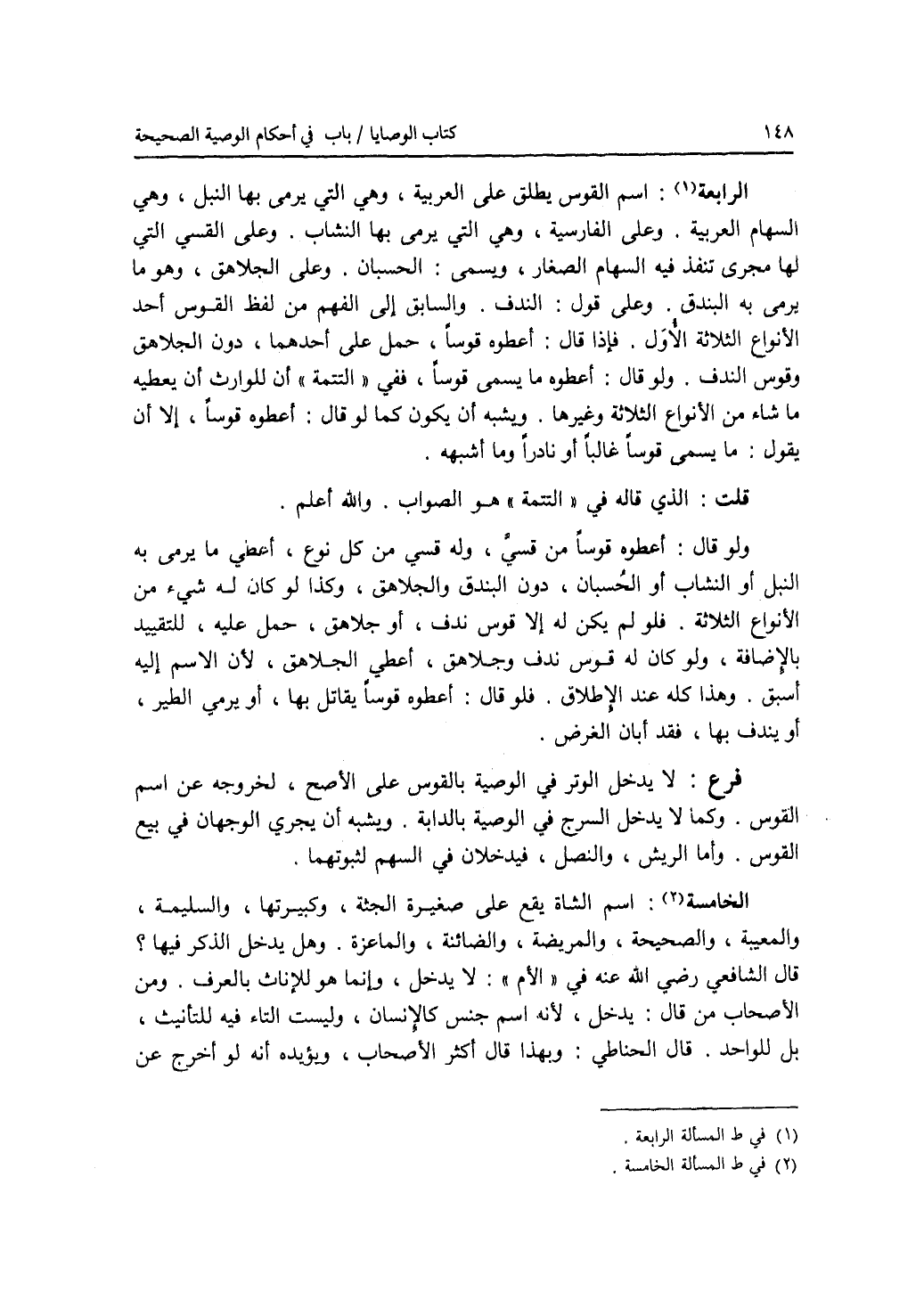 (المسألة) الرابعة: إسم القوس يطلق على العربية، وهي التي يرمى بها النبل، وهي السهام العربية وعلى الفارسية، وهي التي يرمى بها النشاب. وعلى القسي التي لها مجرى تنفذ فيه السهام الصغار، ويسمى: الحسبان. وعلى الجلاهق، وهو ما يرمى به البندق. وعلى قول: الندف. والسابق إلى الفهم من لفظ القوس أحد الانواع الثلاثة الاول. فإذا قال: أعطوه قوسا، حمل على أحدهما، دون الجلاهق وقوس الندف. ولو قال: أعطوه ما يسمى قوسا، ففي التتمة أن للوارث أن يعطيه ما شاء من الانواع الثلاثة وغيرها. ويشبه أن يكون كما لو قال: أعطوه قوسا، إلا أن يقول: ما يسمى قوسا غالبا أو نادرا وما أشبهه. قلت: الذي قاله في التتمة هو الصواب. والله أعلم. ولو قال: أعطوه قوسا من قسي، وله قسي من كل نوع، أعطي ما يرمى به النبل أو النشاب أو الحسبان، دون البندق والجلاهق، وكذا لو كان له شئ من الانواع الثلاثة. فلو لم يكن له إلا قوس ندف، أو جلاهق، حمل عليه، للتقييد بالاضافة، ولو كان له قوس ندف وجلاهق، أعطي الجلاهق، لان الاسم إليه أسبق. وهذا كله عند الاطلاق. فلو قال: أعطوه قوسا يقاتل بها، أو يرمي الطير، أو يندف بها، فقد أبا الغرض. فرع لا يدخل الوتر في الوصية بالقوس على الاصح، لخروجه عن إسم القوس. وكما لا يدخل السرج في الوصية بالدابة. ويشبه أن يجري الوجهان في بيع القوس. وأما الريش، والنصل، فيدخلان في السهم لثبوتهما. (المسألة) الخامسة: إسم الشاة يقع على صغيرة الجثة، وكبيرتها، والسليمة، والمعيبة، والصحيحة، والمريضة، والضائنة، والماعز. وهل يدخل الذكر فيها ؟ قال الشافعي رضي الله عنه في الام: لا يدخل، وإنما هو للاناث بالعرف. ومن الاصحاب من قال: يدخل، لانه إسم جنس كالانسان، وليست التاء فيه للتأنيث، بل للواحد. قال الحناطي: وبهذا قال أكثر الاصحاب، ويؤيده أنه لو أخرج عن