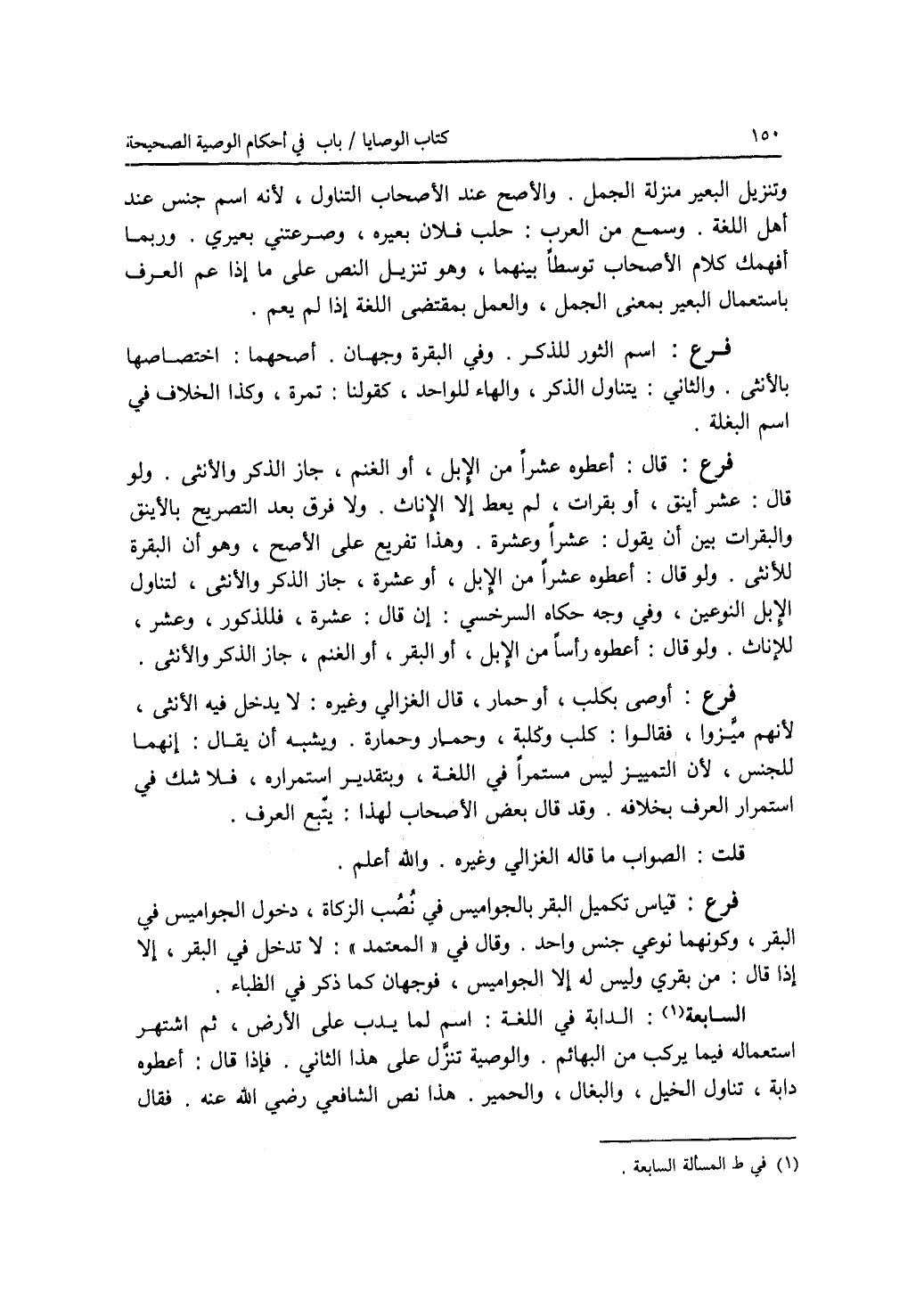 وتنزيل البعير منزلة الجمل. والاصح عند الاصحاب التناول، لانه إسم جنس عند أهل اللغة. وسمع من العرب: حلب فلان بعيره، وصرعتني بعيري. وربما أفهمك كلام الاصحاب توسطا بينهما، وهو تنزيل النص على ما إذا عم العرف باستعمال البعير بمعنى الجمل، والعمل بمقتضى اللغة إذا لم يعم. فرع إسم الثور للذكر. وفي البقرة وجهان. أصحهما: إختصاصها بالانثى. والثاني: يتناول الذكر، والهاء للواحد، كقولنا: تمرة، وكذا الخلاف في إسم البغلة. فرع قال: أعطوه عشرا من الابل، أو الغنم، جاز الذكر والانثى. ولو قال: عشر أينق، أو بقرات، لم يعط إلا الاناث. ولا فرق بعد التصريح بالاينق والبقرات بين أن يقول: عشرا وعشرة. وهذا تفريع على الاصح، وهو أن البقرة للانثى. ولو قال: أعطوه عشرا من الابل، أو عشرة، جاز الذكر والانثى، لتناول الابل النوعين، وفي وجه حكاه السرخسي: إن قال: عشرة، فللذكور، وعشر، للاناث. ولو قال: أعطوه رأسا من الابل، أو البقر، أو الغنم، جاز الذكر والانثى. فرع أوصى بكلب، أو حمار، قال الغزالي وغيره: لا يدخل فيه الانثى، لانهم ميزوا، فقالوا: كلب وكلبة، وحمار وحمارة. ويشبه أن يقال: إنهما للجنس، لان التمييز ليس مستمرا في اللغة، وبتقدير استمراره، فلا شك في استمرار العرف بخلافه. وقد قال بعض الاصحاب لهذا: يتبع العرف. قلت: الصواب ما قاله الغزالي وغيره. والله أعلم. فرع قياس تكميل البقر بالجواميس في نصب الزكاة، دخول الجواميس في البقر، وكونهما نوعي جنس واحد. وقال في المعتمد: لا تدخل في البقر، إلا إذا قال: من بقري وليس له إلا الجواميس، فوجهان كما ذكر في الظباء. (المسألة) السابعة: الدابة في اللغة: إسم لما يدب على الارض، ثم اشتهر استعماله فيما يركب من البهائم. والوصية تنزل على هذا الثاني. فإذا قال: أعطوه دابة، تناول الخيل، والبغال، والحمير. هذا نص الشافعي رضي الله عنه. فقال